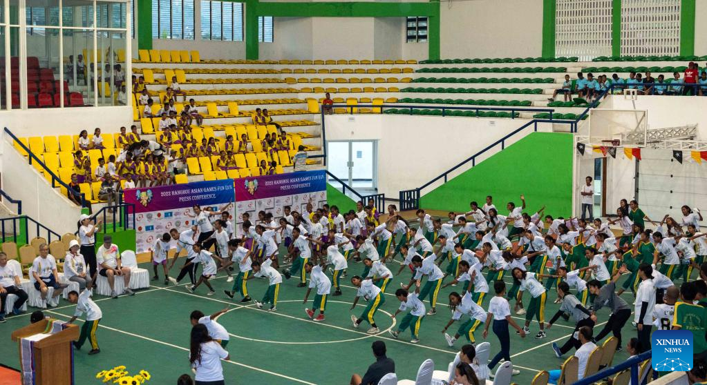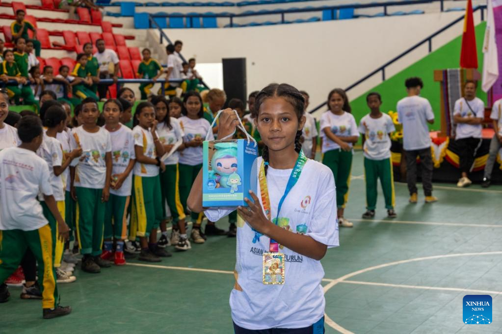Students participate in the 19th Asian Games Fun Run Hang Zhou 2022 event in the Sunrise Building Sports Center in Dili, capital of Timor-Leste, on July 1, 2023. (National Olympic Committee of Timor-Leste/Handout via Xinhua)