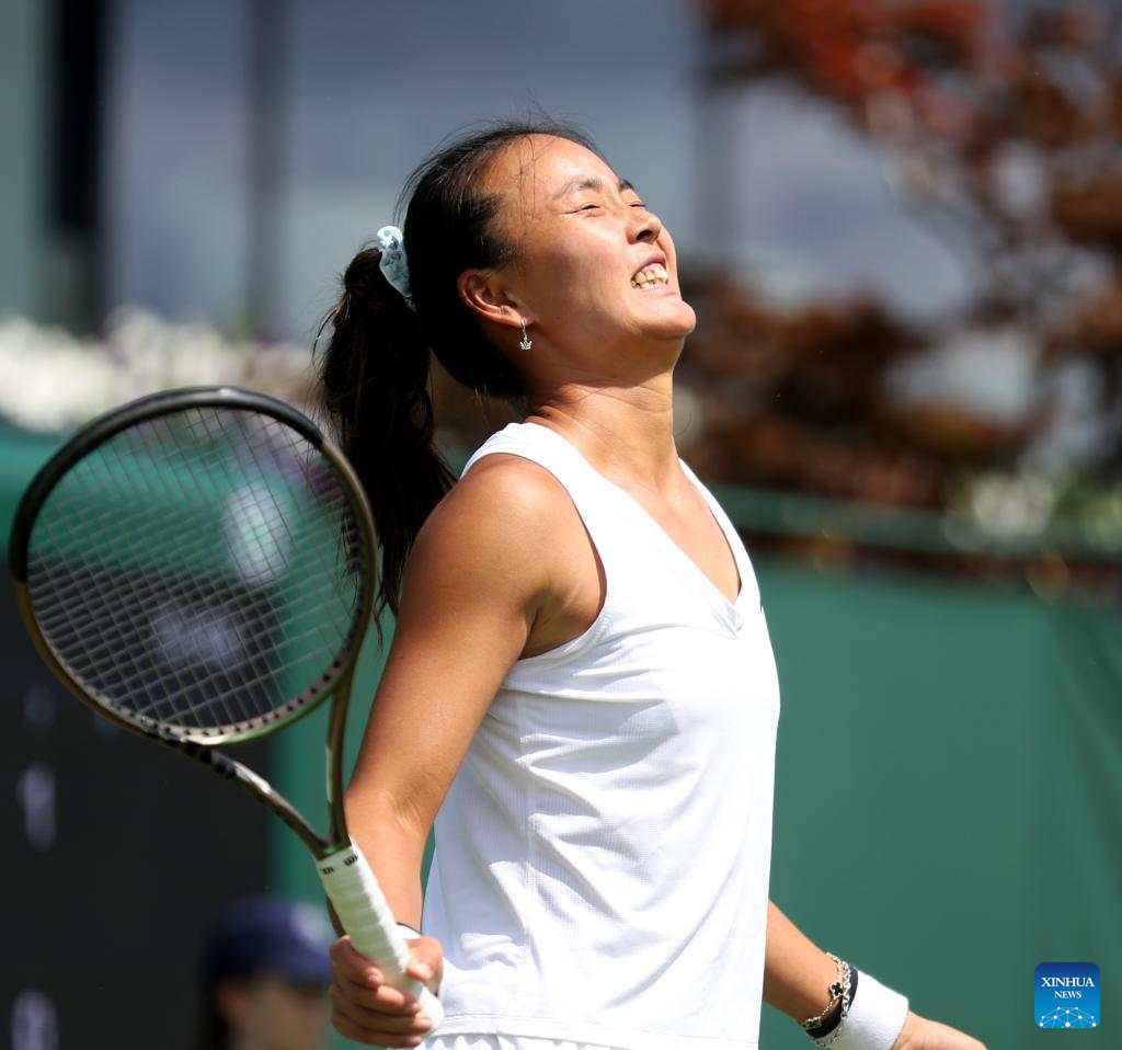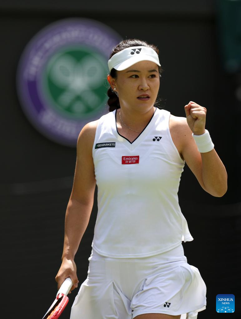 Zhu Lin of China celebrates for scoring while competing against Iga Swiatek of Poland during the women's singles 1st round match at Wimbledon Tennis Championship in London, Britain, on July 3, 2023. (Xinhua/Han Yan)
