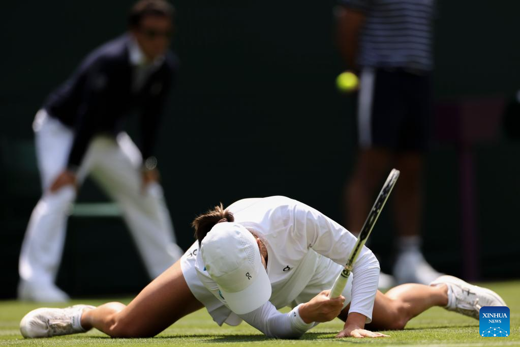 Zhu Lin of China reacts while competing against Iga Swiatek of Poland during the women's singles 1st round match at Wimbledon Tennis Championship in London, Britain, on July 3, 2023. (Xinhua/Han Yan)