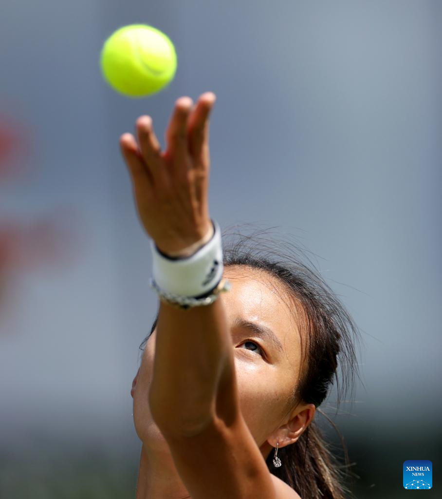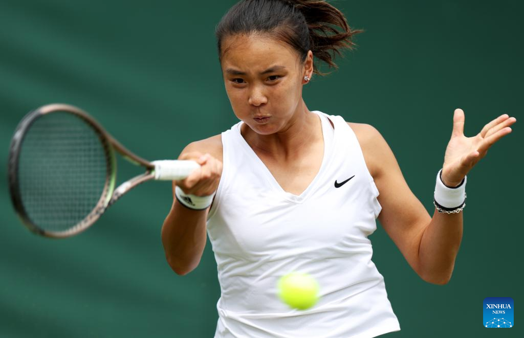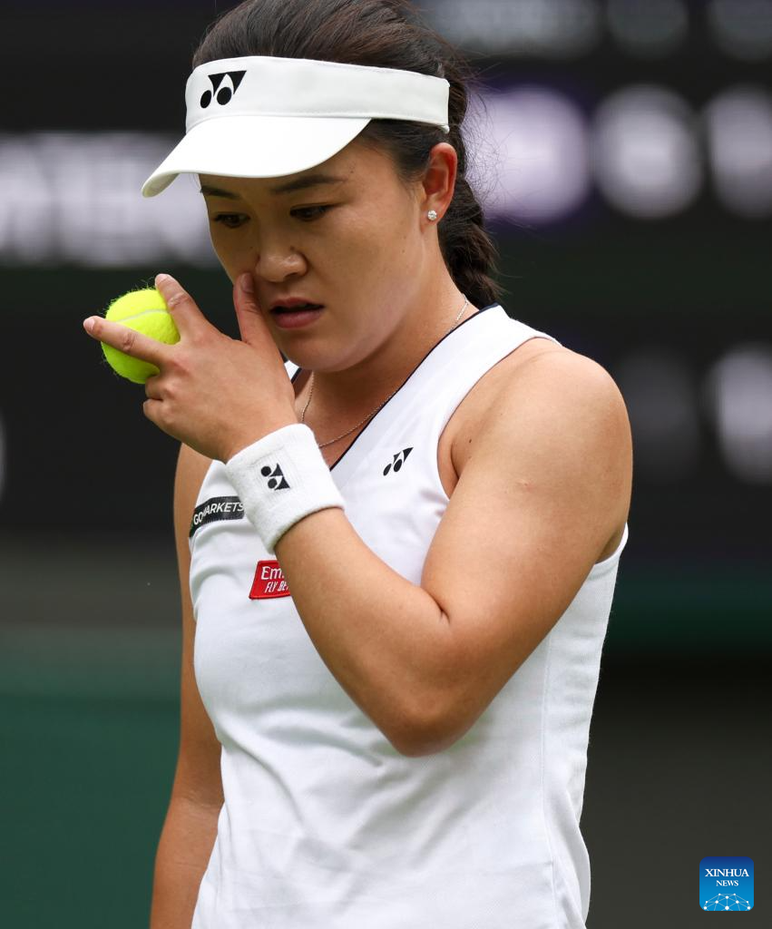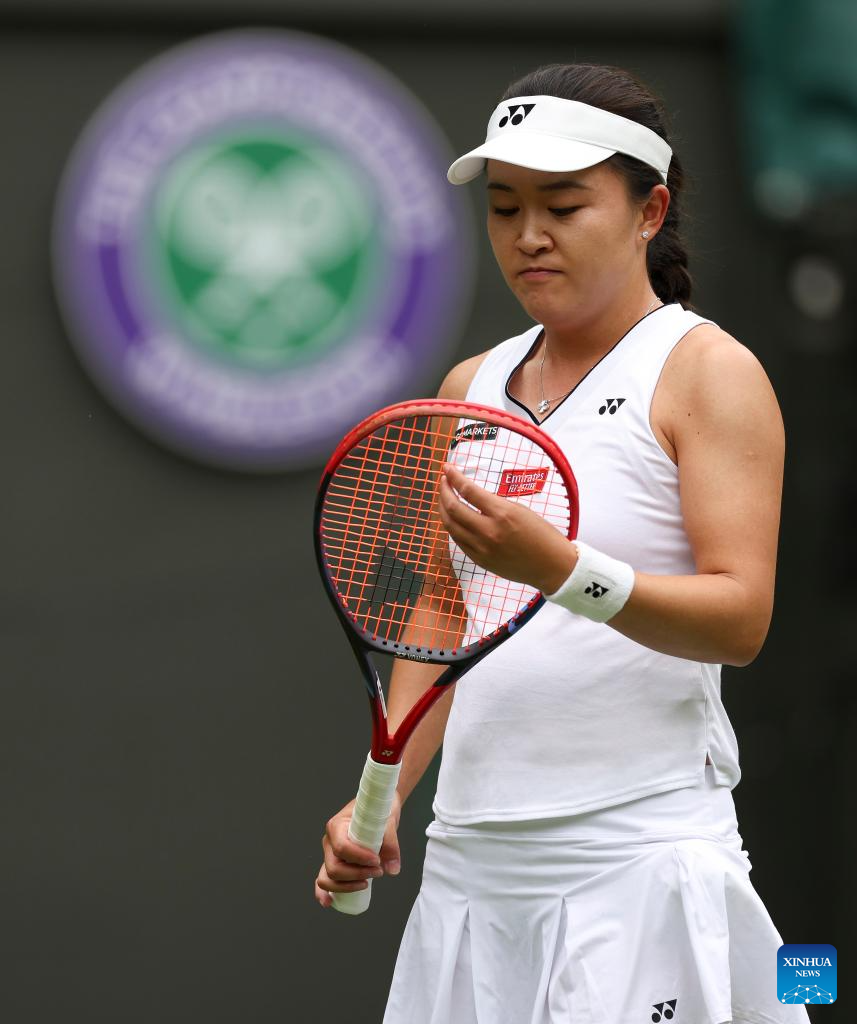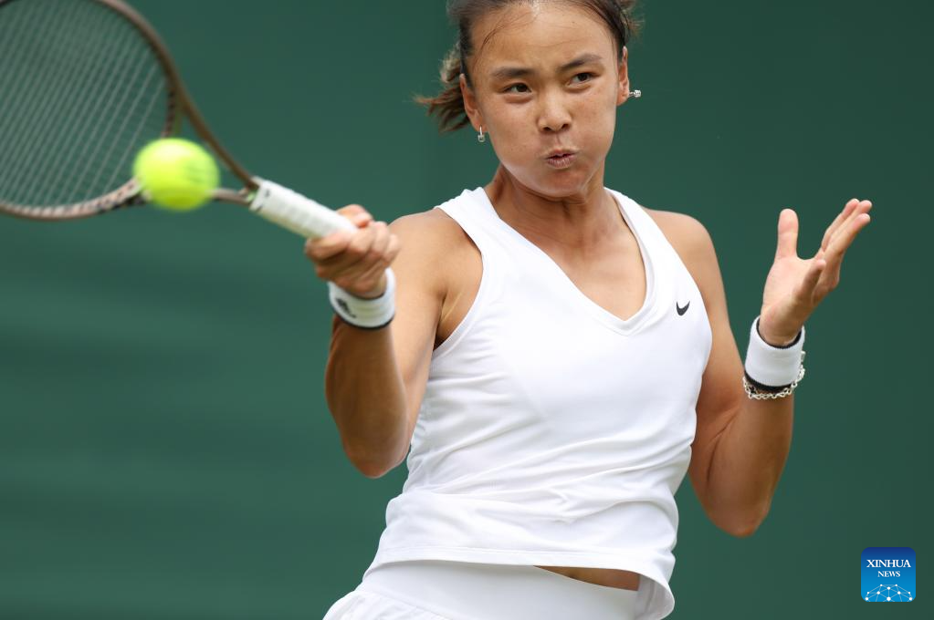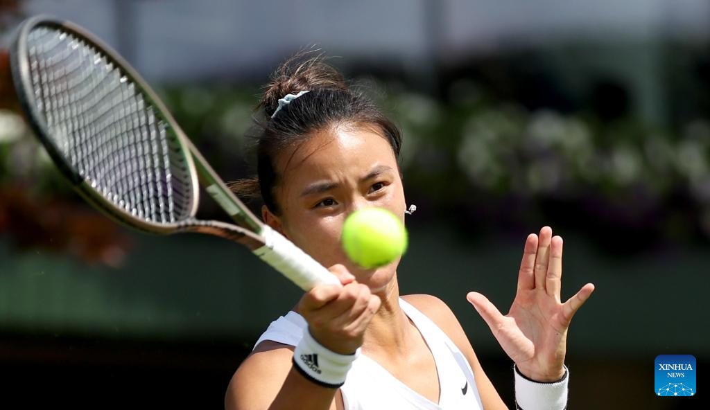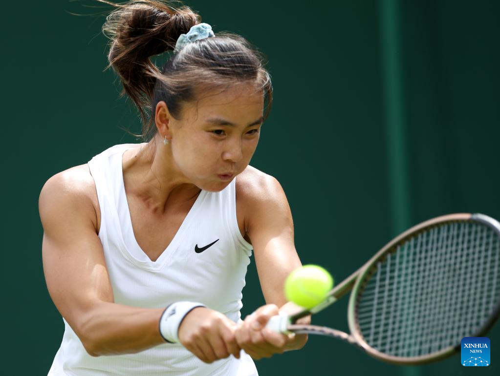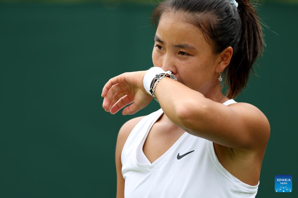 Zhu Lin of China competes during the women's singles 1st round match against Iga Swiatek of Poland at Wimbledon Tennis Championship in London, Britain, on July 3, 2023. (Xinhua/Han Yan)