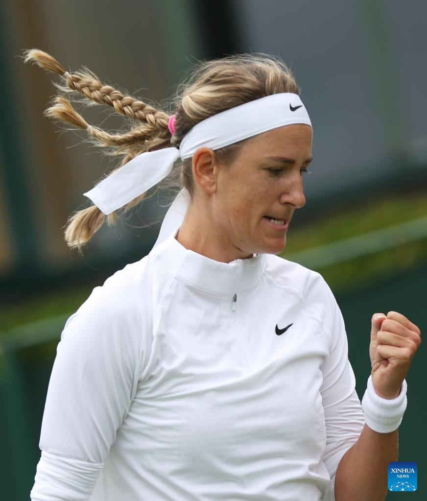Victoria Azarenka of Belarus celebrates scoring while competing against Yuan Yue of China during the women's singles 1st round match at Wimbledon Tennis Championship in London, Britain, on July 3, 2023. (Xinhua/Li Ying)