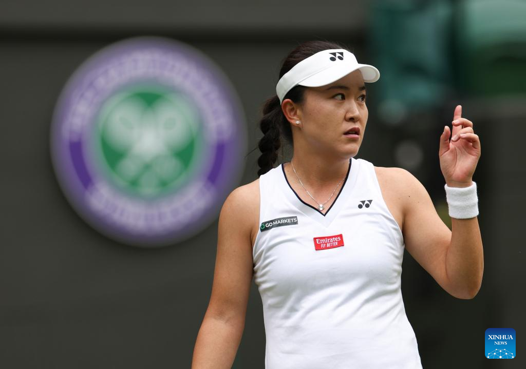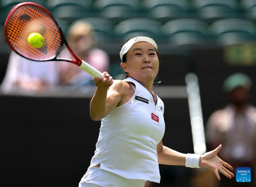 Yuan Yue of China competes during the women's singles 1st round match against Victoria Azarenka of Belarus at Wimbledon Tennis Championship in London, Britain, on July 3, 2023. (Xinhua/Li Ying)