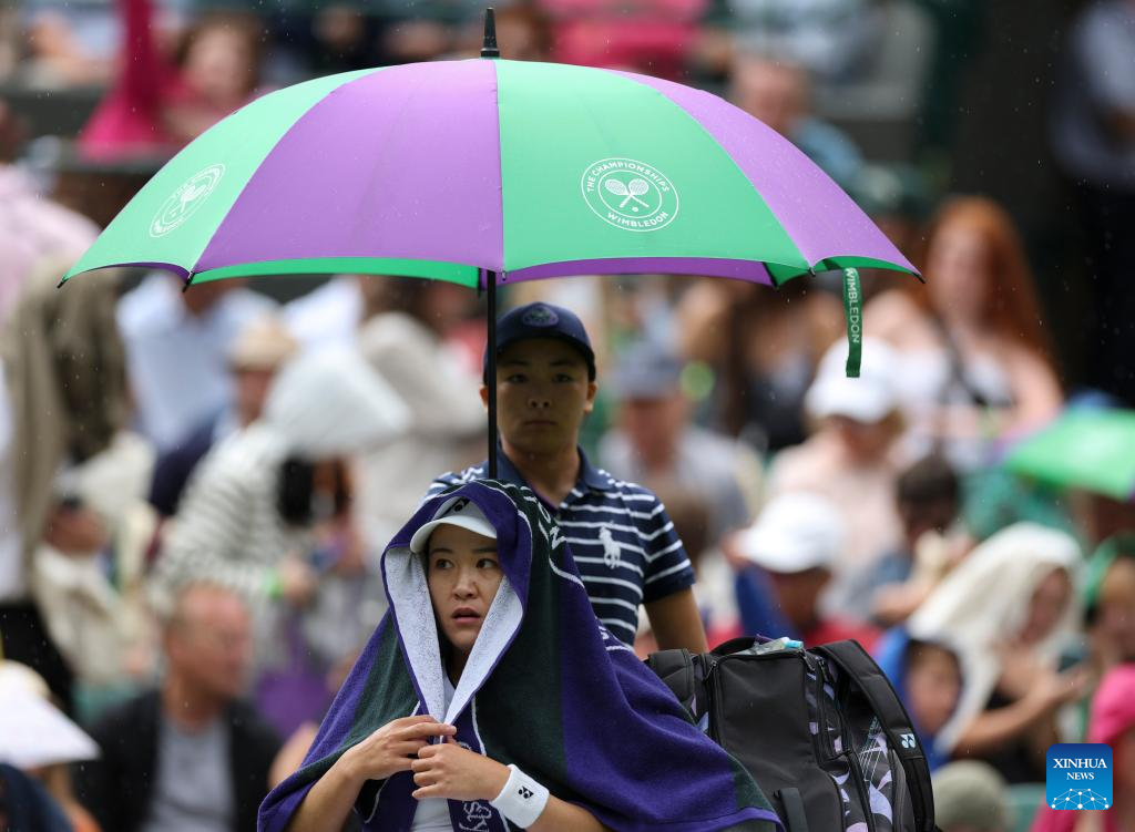 Zhu Lin (below) of China is covered with towel in the rain while competing against Iga Swiatek of Poland during the women's singles 1st round match at Wimbledon Tennis Championship in London, Britain, on July 3, 2023. (Xinhua/Han Yan)