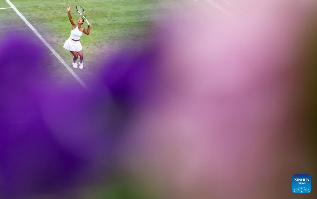 Leylah Annie Fernandez of Canada competes during the women's singles 1st round match against Kateryna Baindl of Ukraine at Wimbledon Tennis Championship in London, Britain, on July 3, 2023. (Xinhua/Li Ying)