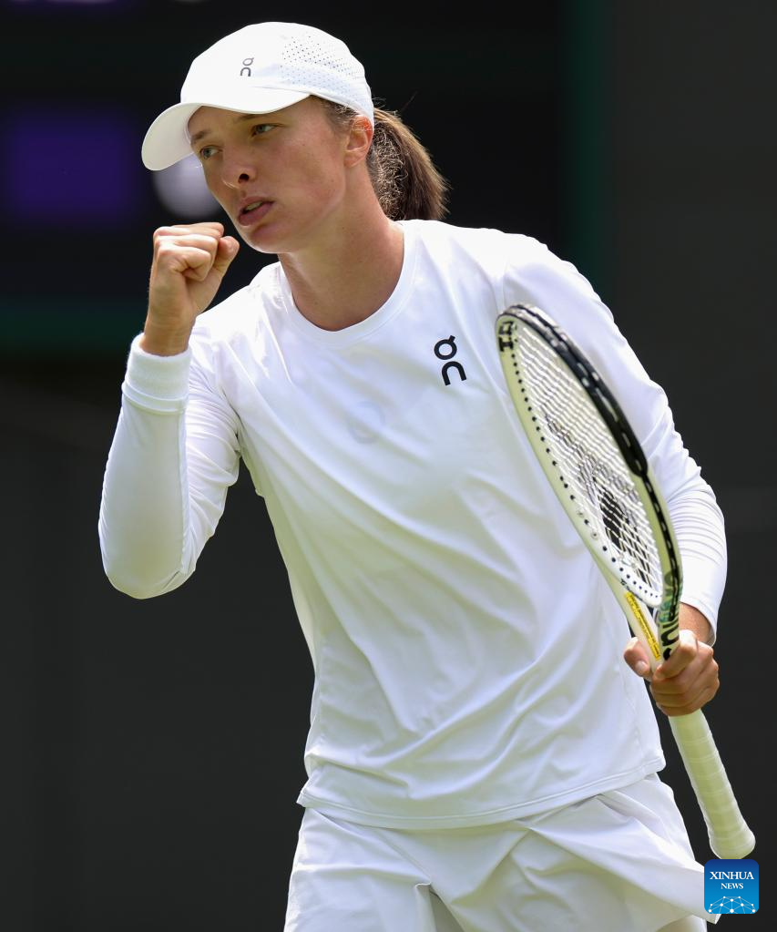 Iga Swiatek of Poland competes during the women's singles 1st round match against Zhu Lin of China at Wimbledon Tennis Championship in London, Britain, on July 3, 2023. (Xinhua/Han Yan)