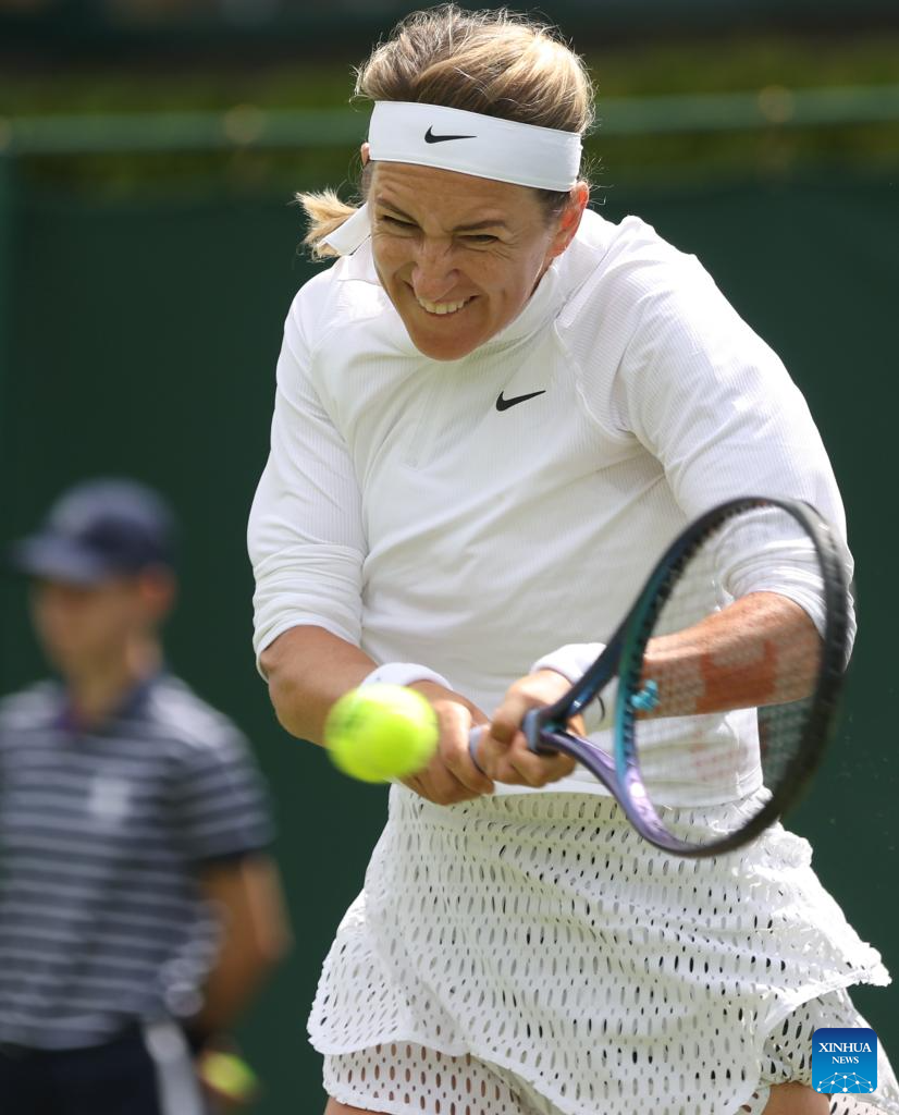 Victoria Azarenka of Belarus competes during the women's singles 1st round match against Yuan Yue of China at Wimbledon Tennis Championship in London, Britain, on July 3, 2023. (Xinhua/Li Ying)