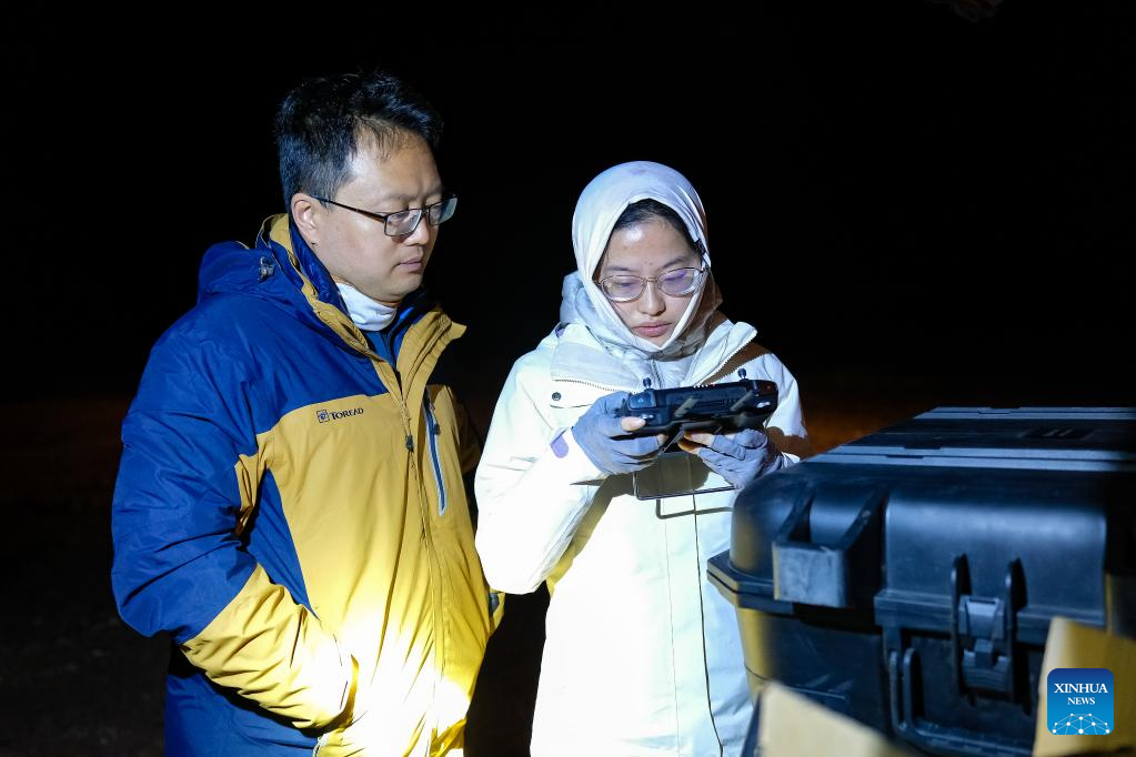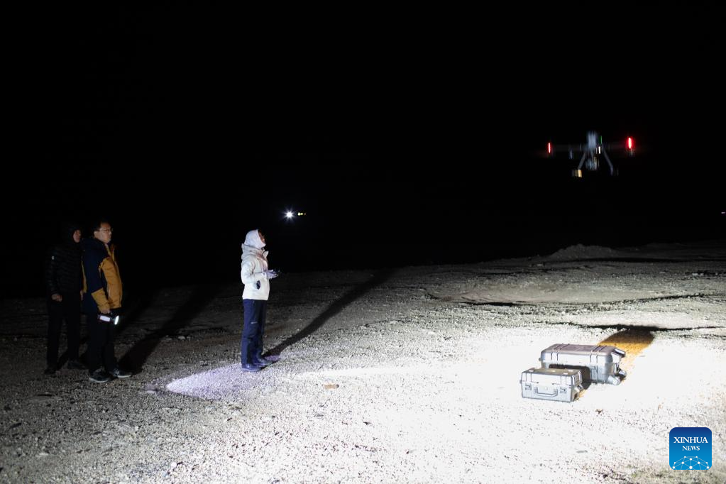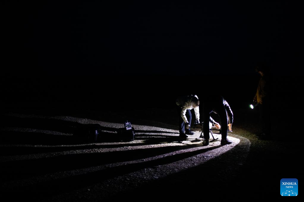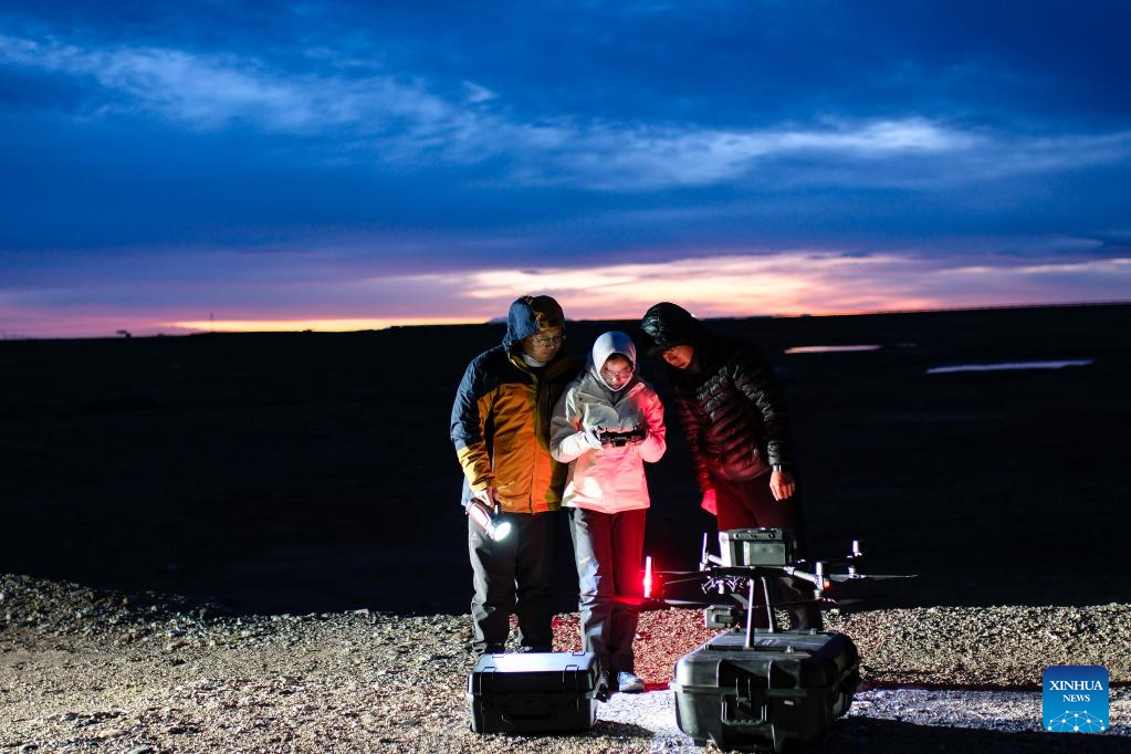 Lian Xinming and his team members prepare to use a drone to monitor an overnight habitat of Tibetan antelopes during their migration near the Qumar River Bridge along the Qinghai-Tibet Highway in Hoh Xil, a natural reserve in northwest China's Qinghai Province, on the early hours of June 16, 2023.