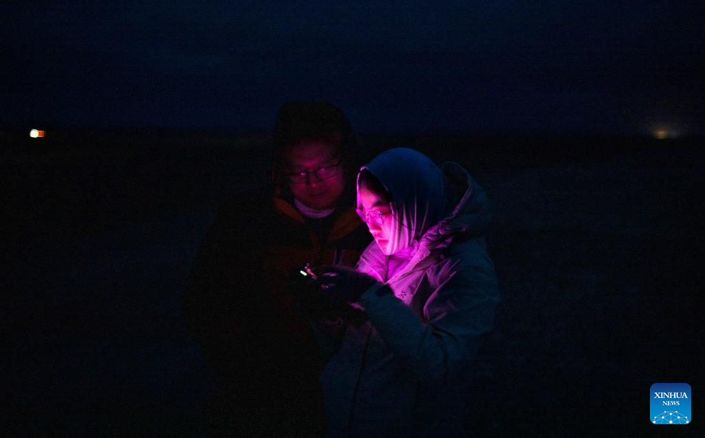 Lian Xinming (L) and his student Wang Zihan use a drone to monitor an overnight habitat of Tibetan antelopes during their migration near the Qumar River Bridge along the Qinghai-Tibet Highway in Hoh Xil, a natural reserve in northwest China's Qinghai Province, on the early hours of June 16, 2023.
