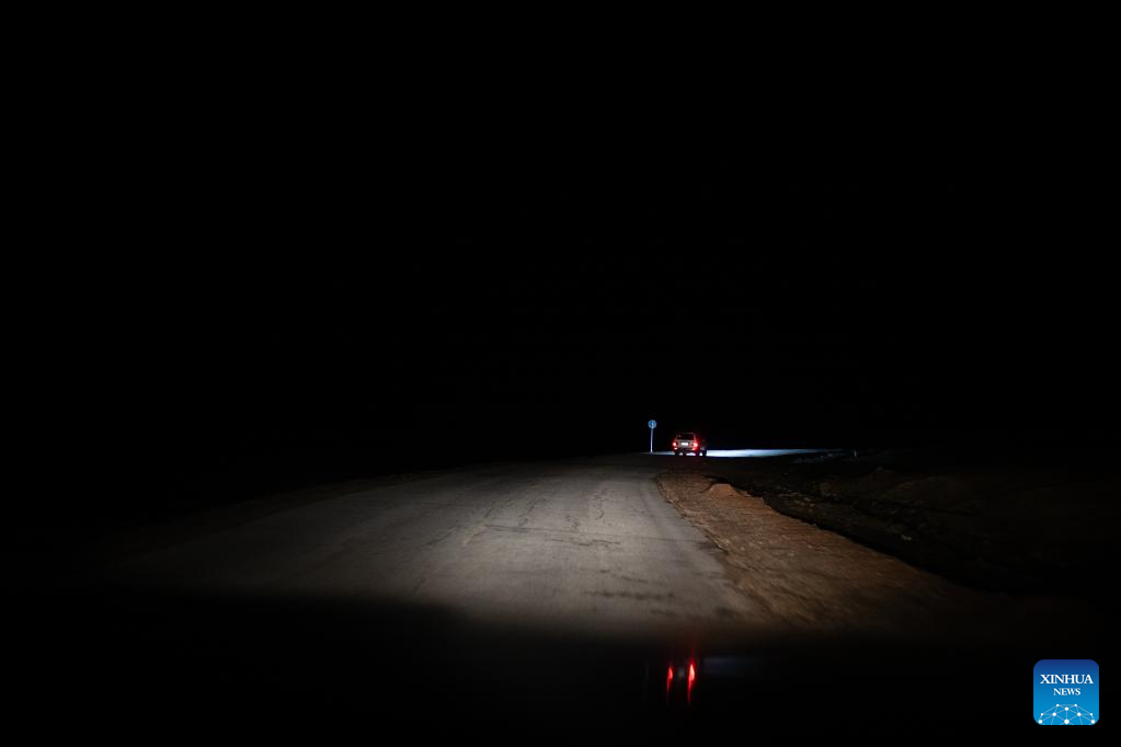 Lian Xinming and his team members drive to an overnight habitat of Tibetan antelopes during their migration near the Qumar River Bridge along the Qinghai-Tibet Highway in Hoh Xil, a natural reserve in northwest China's Qinghai Province, on the early hours of June 16, 2023.