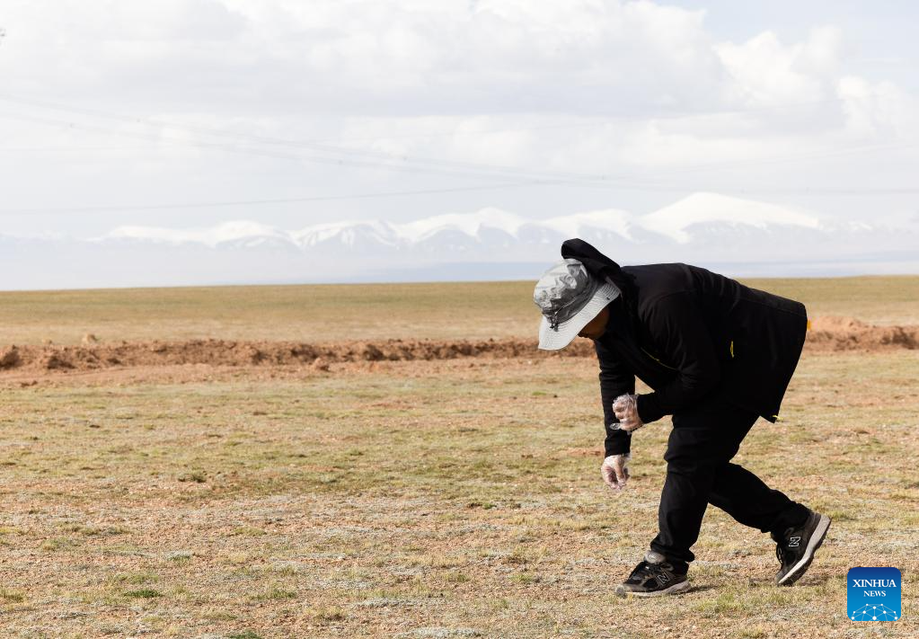 Lian Xinming collects the feces of Tibetan antelopes for research in Hoh Xil, a natural reserve in northwest China's Qinghai Province, June 15, 2023.