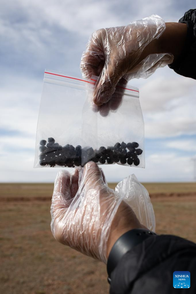 Lian Xinming shows the feces of Tibetan antelopes he collected for research in Hoh Xil, a natural reserve in northwest China's Qinghai Province, June 15, 2023.