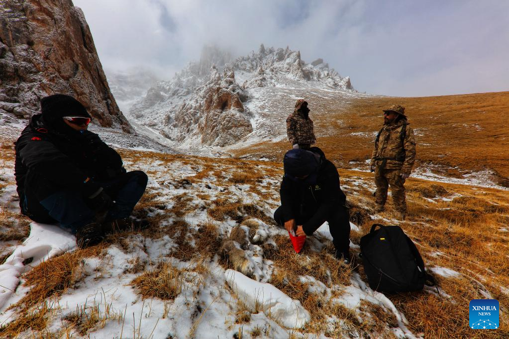 This file photo taken in March 2019 shows Lian Xinming (R, front) collecting samples in the Sanjiangyuan area in northwest China's Qinghai Province.