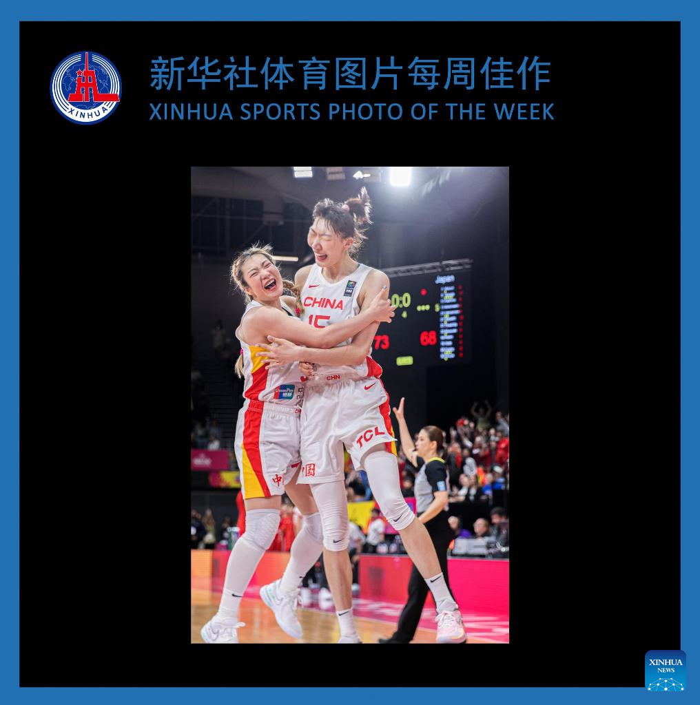 Li Meng (L) and Han Xu of China celebrate during the final against Japan at the 2023 FIBA Women's Asia Cup in Sydney, Australia, July 2, 2023. (Photo by Hu Jingchen/Xinhua)