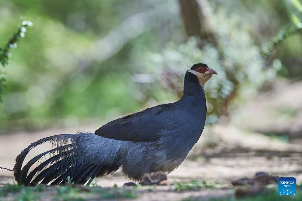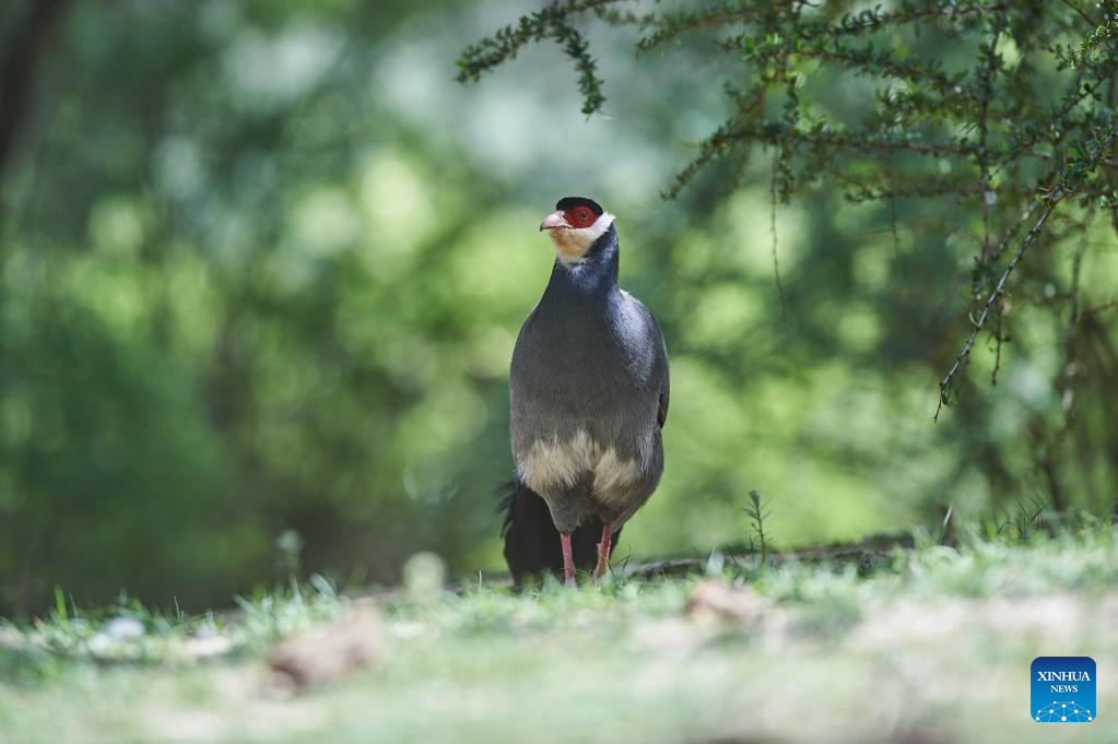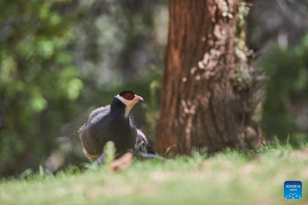 A white eared pheasant (Crossoptilon crossoptilon) is observed near Lhasa, southwest China's Tibet Autonomous Region, July 2, 2023. The white eared pheasant (Crossoptilon crossoptilon) is a bird endemic to China that is under second-class national protection. (Xinhua/Dainzin Nyima Choktrul)