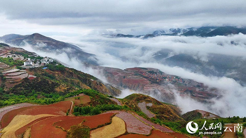 Colorful terraced fields shrouded in mist in Hongtudi township, Dongchuan district, Kunming city, southwest China's Yunnan Province. (Photo/Ye Zhigang)