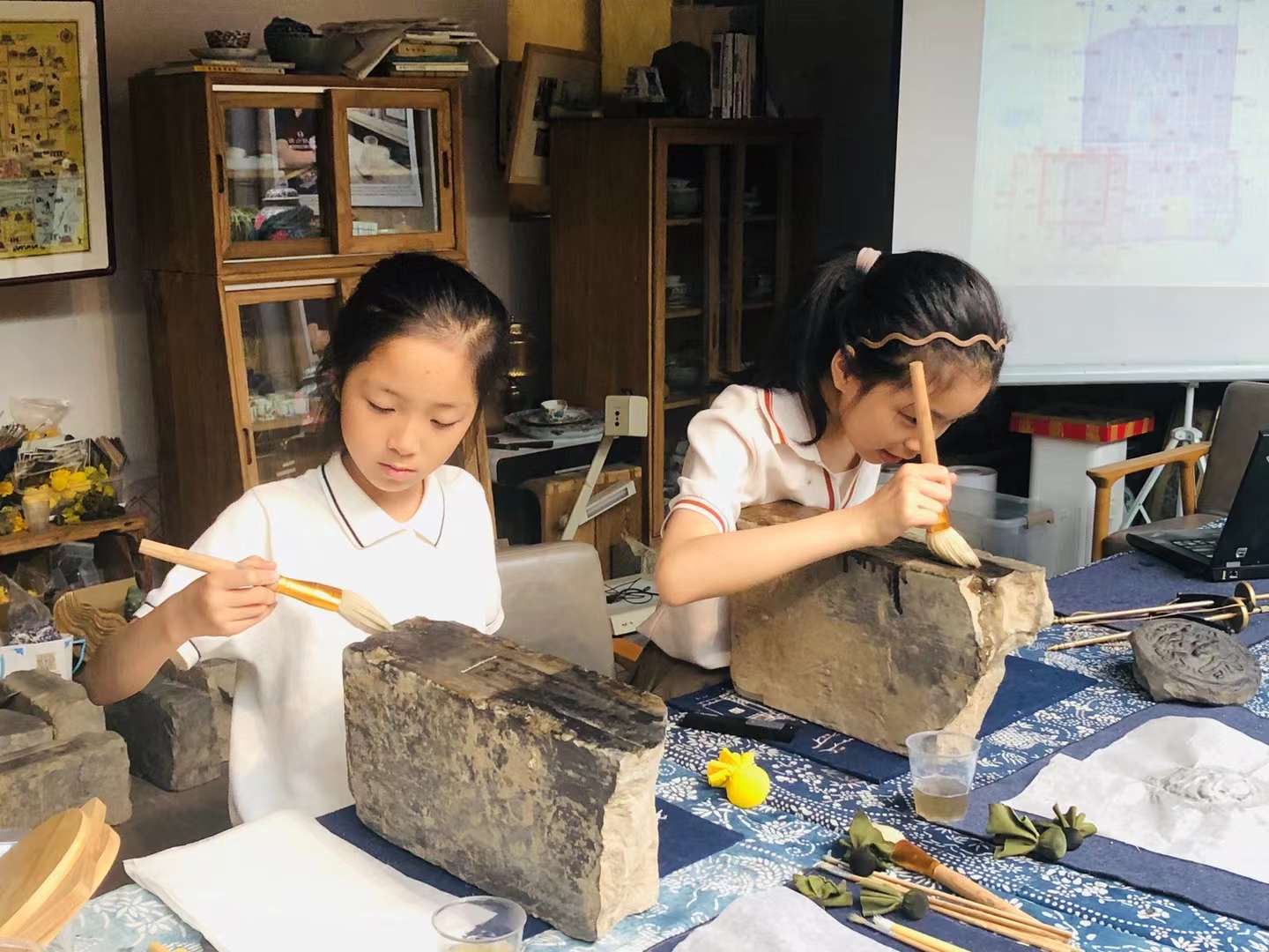 Children engage in traditional rubbing crafts at QianKun Space in Beijing. The creation of rubbings from tablet inscriptions is a craft with a history spanning over 1,000 years in China, invented as a method of document duplication before the advent of printing. (Photo provided to People's Daily Online)