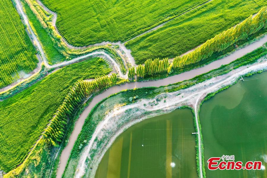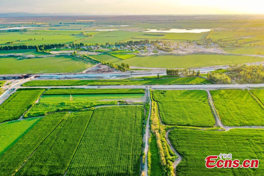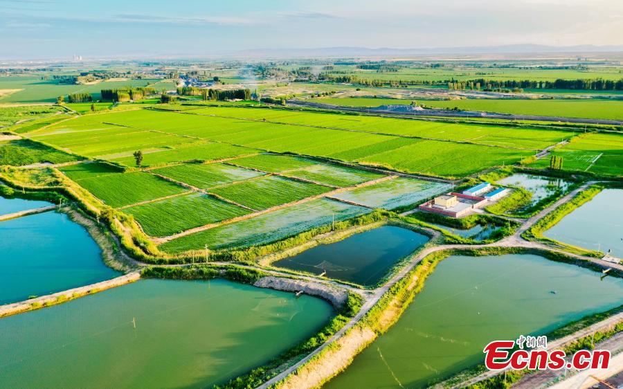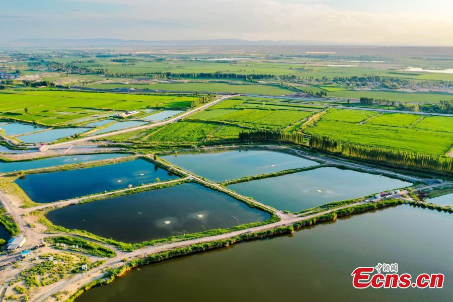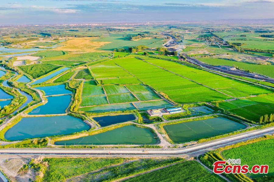 Fish ponds and lush green fields form a unique pastoral picture in Hui Autonomous Prefecture of Changji, northwest China's Xinjiang Uygur Autonomous Region. (Photo: China News Service/Tao Weiming)