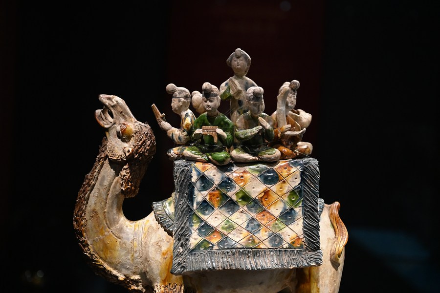 This photo taken on May 11, 2023 shows a Tang Dynasty (618-907) tri-colored figurine of camel-riding musicians at Shaanxi History Museum in Xi'an, northwest China's Shaanxi Province. (Xinhua/Li Yibo)