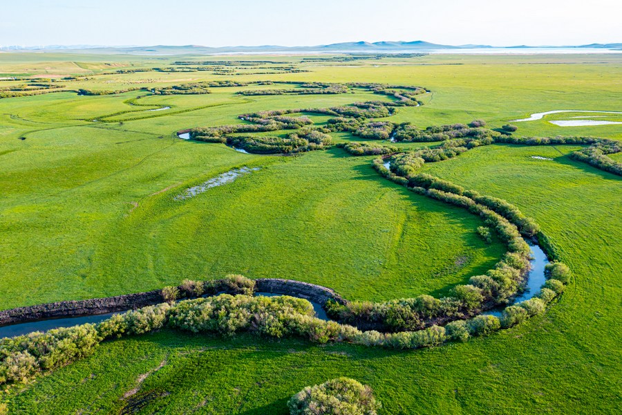 This aerial photo taken on June 12, 2023 shows the scenery of a grassland in Xilingol League of north China's Inner Mongolia Autonomous Region. (Xinhua/Peng Yuan)