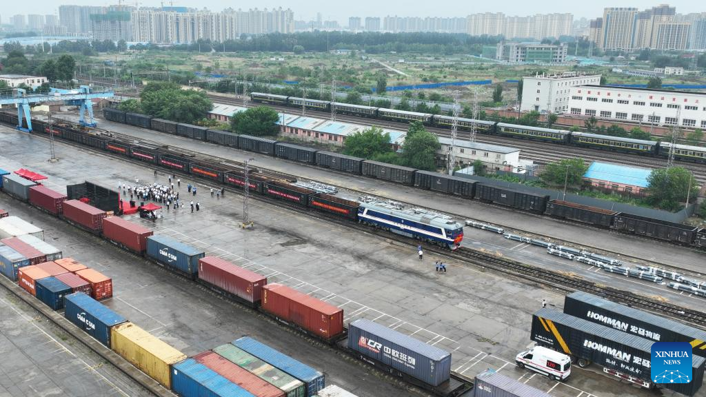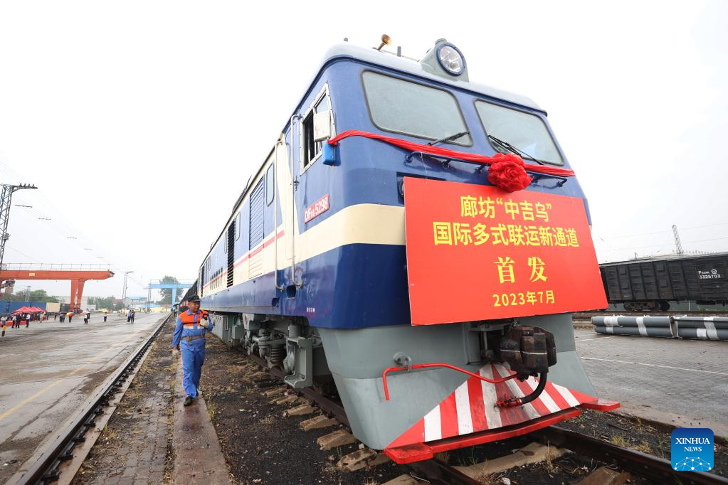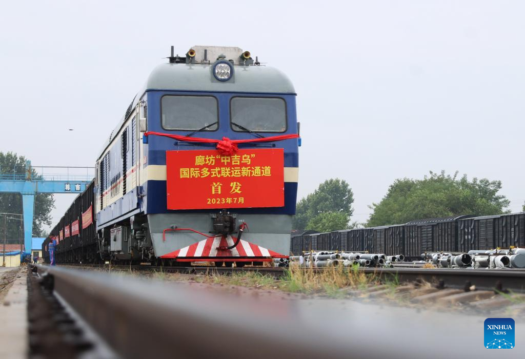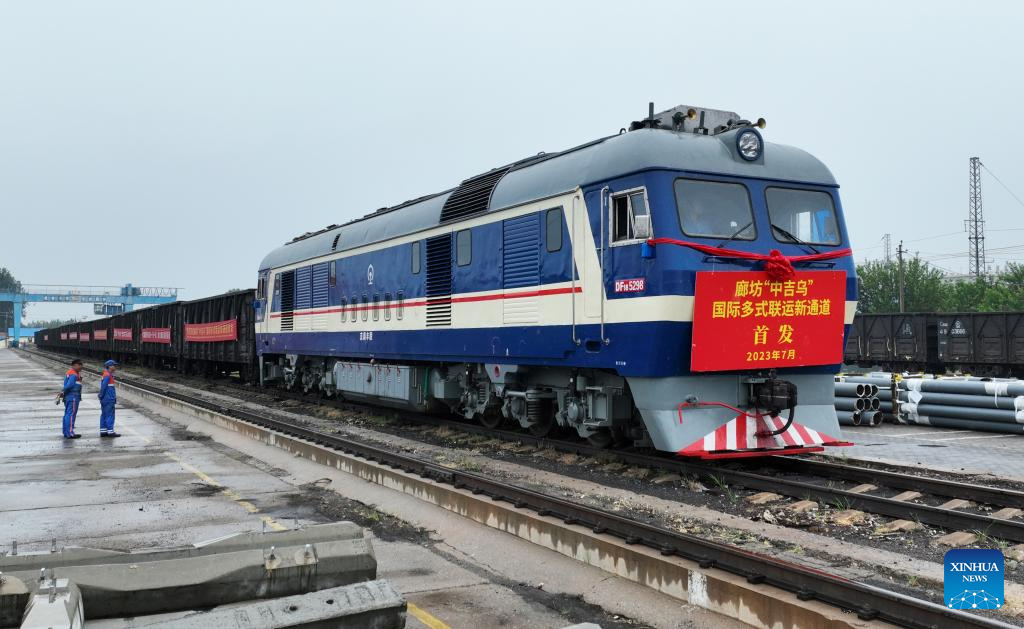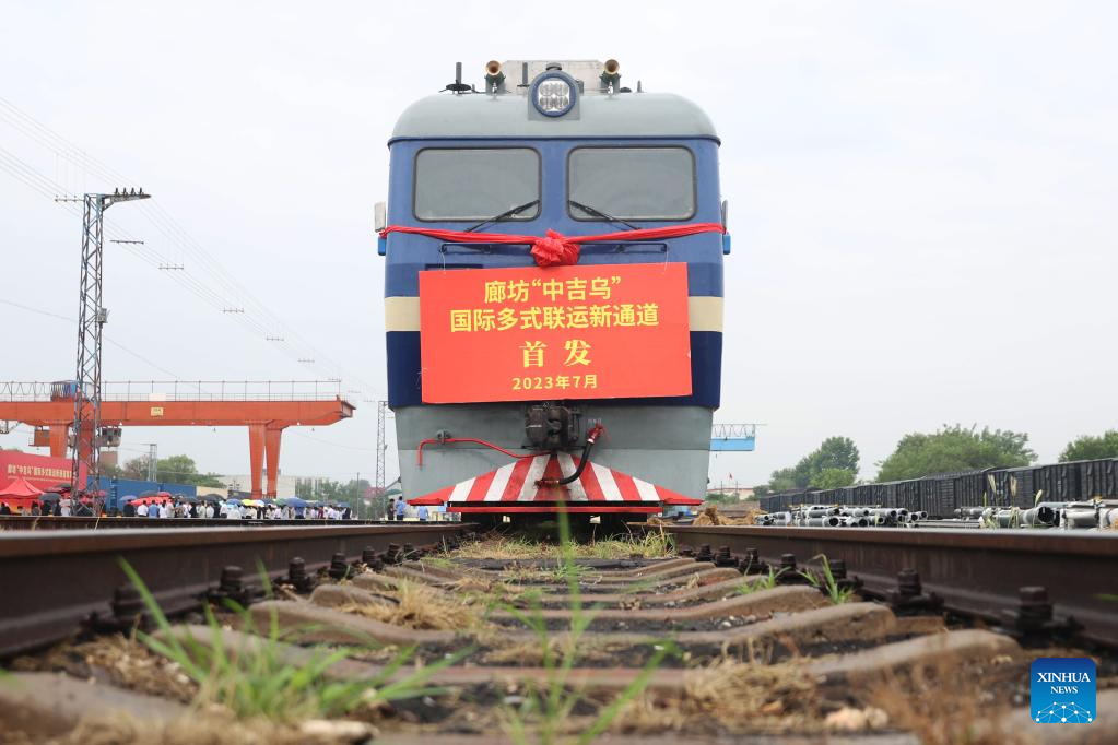 This photo shows the first train of a new international multimodal transport route departing from Langfang City, north China's Hebei Province, July 4, 2023. (Photo by Jia Jun/Xinhua)