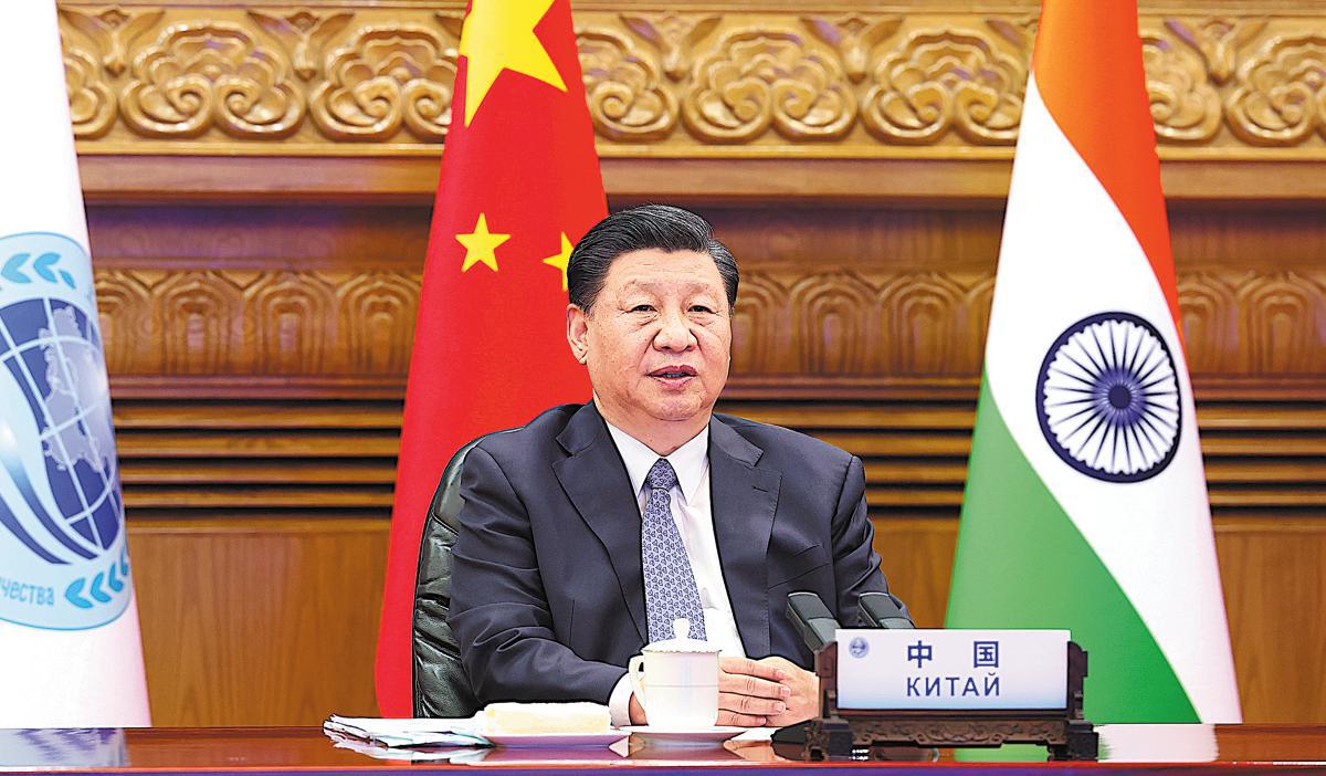 President Xi Jinping addresses on Tuesday the 23rd meeting of the Council of Heads of State of the Shanghai Cooperation Organization via video link from Beijing. [Photo by Feng Yongbin / China Daily]