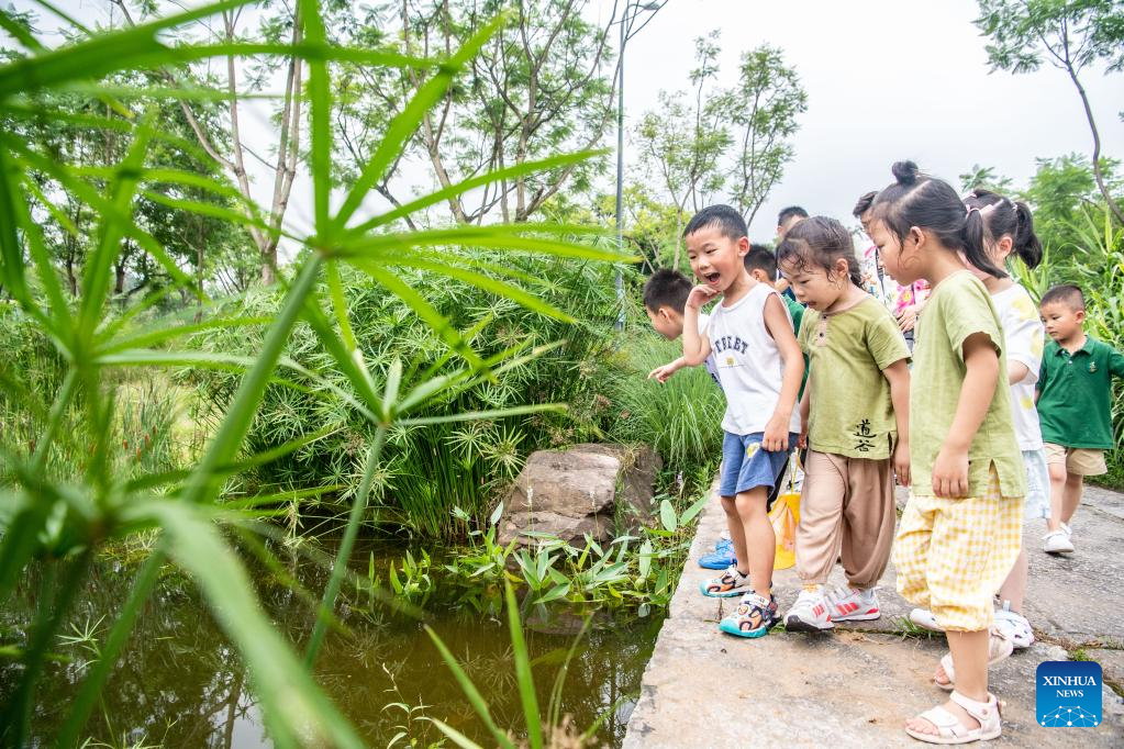 Children learn to identify plants during an ecological education tour on Guangyang Isle in southwest China's Chongqing, July 3, 2023. (Xinhua/Tang Yi)