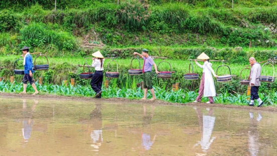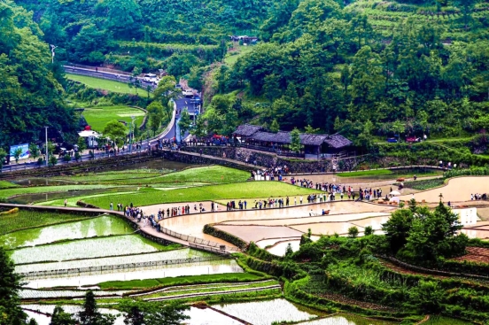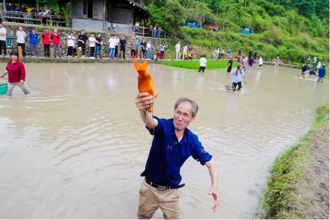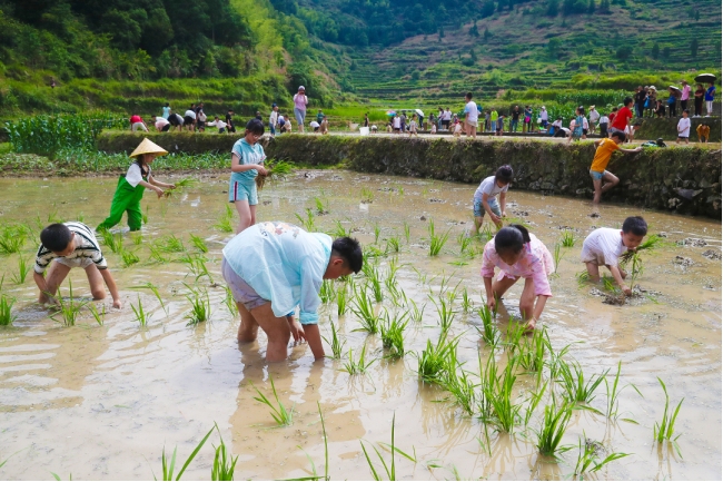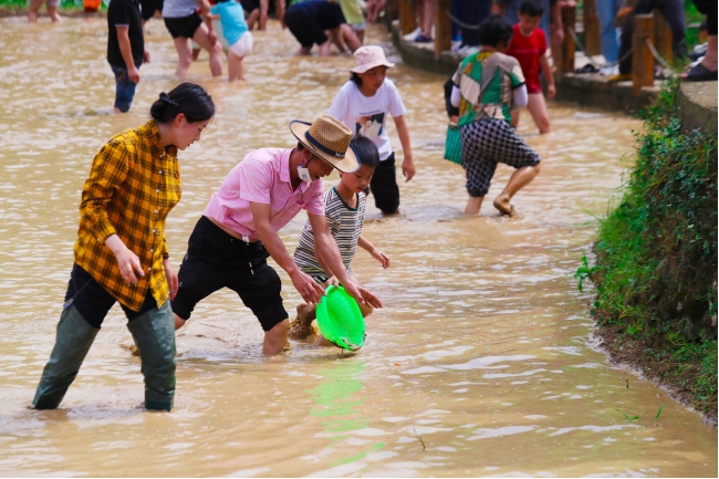 Visitors enjoy themselves during a plough festival held on terraced fields in Ming'ao Village, Yongjia County of Wenzhou, east China's Zhejiang Province. A plough festival was held recently on terraced fields in Ming'ao Village, attracting many visitors across the country. Under the Green Rural Revival Program launched in Zhejiang, local rural tourism has thrived. (Xinhuanet/Hu Jinbiao)
