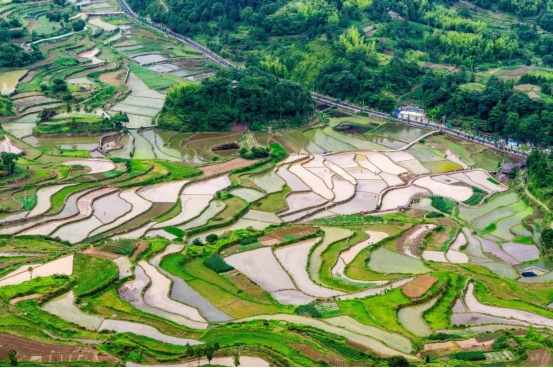 This aerial photo shows terraced fields in Mingao Village, Yongjia County of Wenzhou, east China's Zhejiang Province. A plough festival was held recently on terraced fields in Ming'ao Village, attracting many visitors across the country. Under the Green Rural Revival Program launched in Zhejiang, local rural tourism has thrived. (Xinhuanet/Hu Jinbiao)