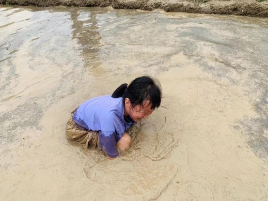 A girl enjoys herself during a plough festival held on terraced fields in Ming'ao Village, Yongjia County of Wenzhou, east China's Zhejiang Province. A plough festival was held recently on terraced fields in Ming'ao Village, attracting many visitors across the country. Under the Green Rural Revival Program launched in Zhejiang, local rural tourism has thrived. (Xinhuanet/Hu Jinbiao)