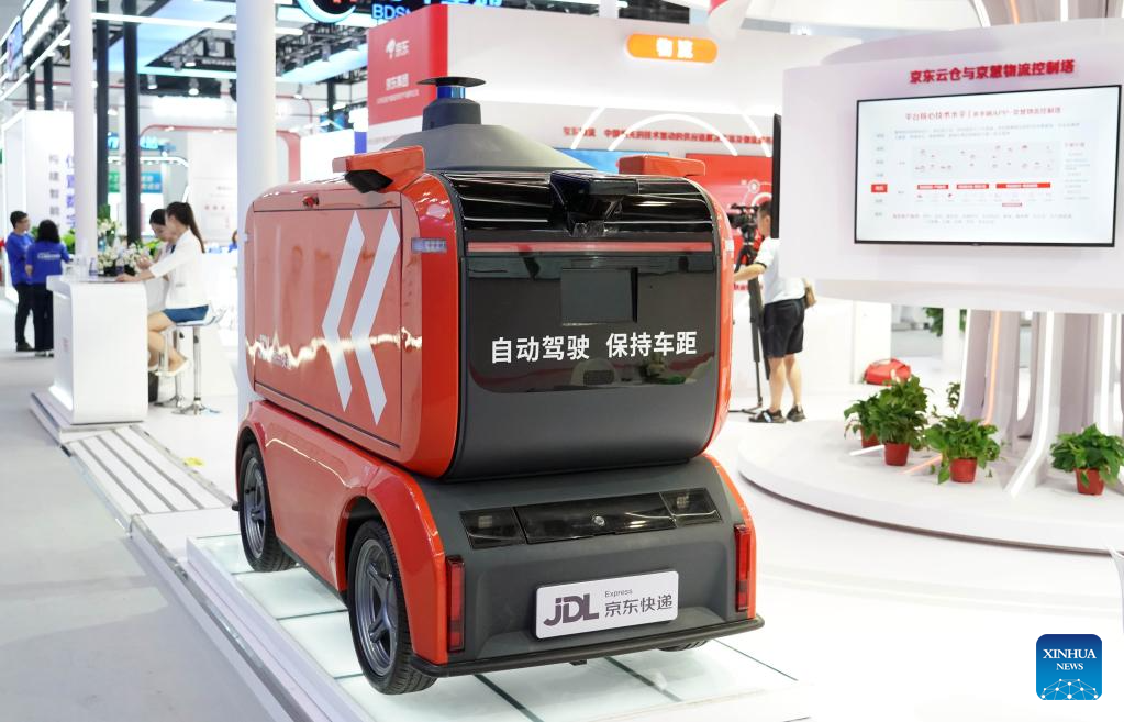 This photo taken on July 4, 2023 shows an unmanned delivery vehicle at an exhibition during the Global Digital Economy Conference 2023 at the China National Convention Center in Beijing, capital of China. The Global Digital Economy Conference 2023 is scheduled from July 4 to 7 in Beijing. (Xinhua/Ren Chao)