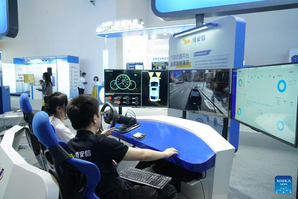 A staff member (R) demonstrates features of a vehicle safety simulation platform at an exhibition during the Global Digital Economy Conference 2023 at the China National Convention Center in Beijing, capital of China, on July 4, 2023. The Global Digital Economy Conference 2023 is scheduled from July 4 to 7 in Beijing. (Xinhua/Ren Chao)