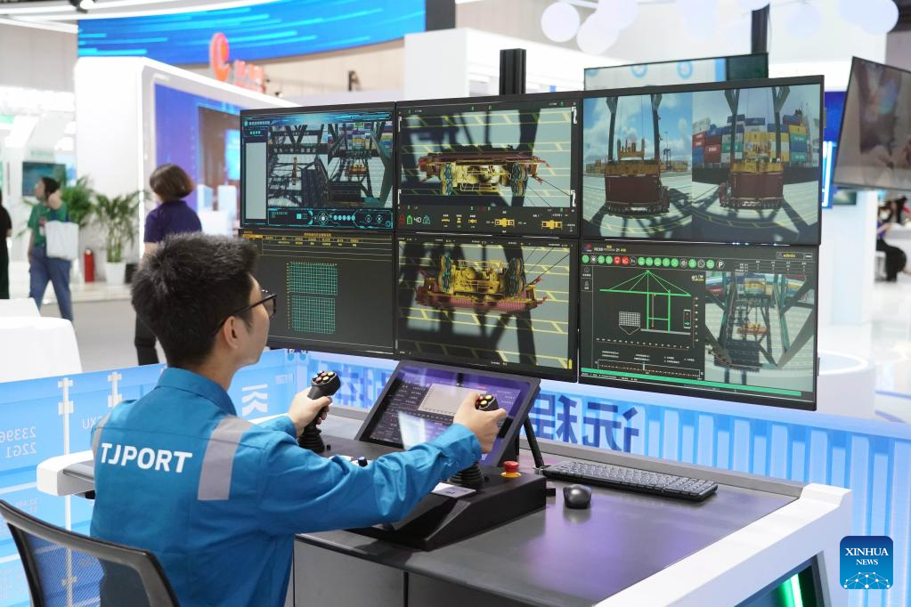 A staff member displays a shore crane remote control simulation system at an exhibition during the Global Digital Economy Conference 2023 at the China National Convention Center in Beijing, capital of China, on July 4, 2023. The Global Digital Economy Conference 2023 is scheduled from July 4 to 7 in Beijing. (Xinhua/Ren Chao)