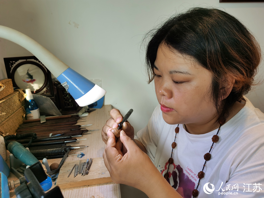 A fruit pit carving artist creates a piece of work. (People's Daily Online/Wang Jiliang)