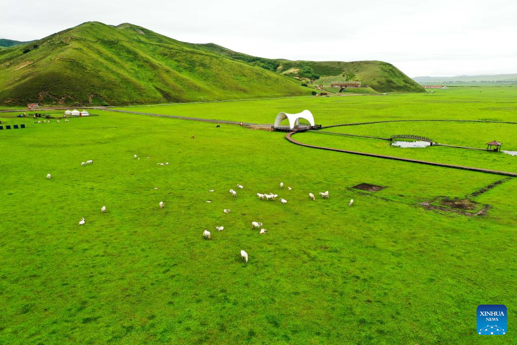 This aerial photo taken on July 5, 2023 shows the summer scenery of the Ulan Mod grassland in Horqin Right Wing Front Banner of Hinggan League, north China's Inner Mongolia Autonomous Region. (Xinhua/Li Zhipeng)