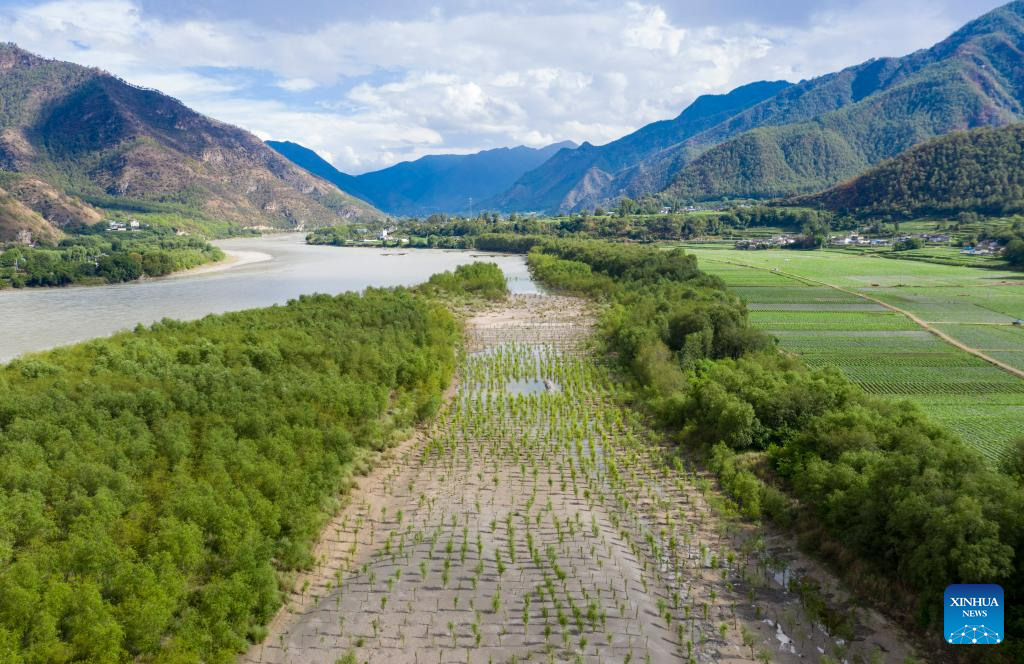 This aerial photo taken on June 20, 2023 shows willow forest belts along the Jinsha River in Shigu Town of Lijiang City, southwest China's Yunnan Province. Shigu Town of Lijiang City is located by a huge bend of the Jinsha River, the upper section of the Yangtze River in southwest China. The footprints of the Red Army are forever engraved in the town's culture and spirits. The Central Yunnan Water Diversion Project, a national key project for water conservancy, is under construction and is expected to benefit more people after completion. Generations of locals have worked hard to plant willows along the river to protect water, soil and the ecological environment. By the river thrives a new Shigu Town. (Xinhua/Chen Xinbo)