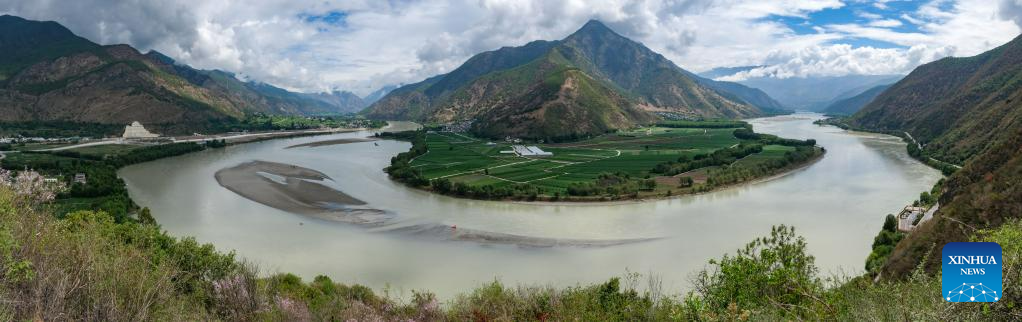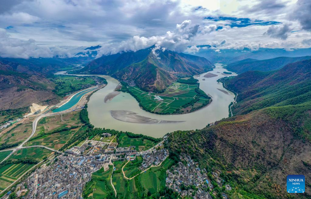 This photo taken on June 20, 2023 from Shigu Town of Lijiang City shows a bend of the Jinsha River in southwest China's Yunnan Province. Shigu Town of Lijiang City is located by a huge bend of the Jinsha River, the upper section of the Yangtze River in southwest China. The footprints of the Red Army are forever engraved in the town's culture and spirits. The Central Yunnan Water Diversion Project, a national key project for water conservancy, is under construction and is expected to benefit more people after completion. Generations of locals have worked hard to plant willows along the river to protect water, soil and the ecological environment. By the river thrives a new Shigu Town. (Xinhua/Zhang Cheng)