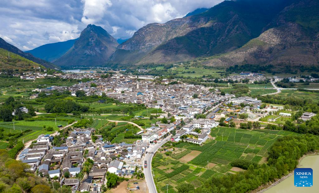 This aerial photo taken on June 20, 2023 shows a view of Shigu Town of Lijiang City, southwest China's Yunnan Province. Shigu Town of Lijiang City is located by a huge bend of the Jinsha River, the upper section of the Yangtze River in southwest China. The footprints of the Red Army are forever engraved in the town's culture and spirits. The Central Yunnan Water Diversion Project, a national key project for water conservancy, is under construction and is expected to benefit more people after completion. Generations of locals have worked hard to plant willows along the river to protect water, soil and the ecological environment. By the river thrives a new Shigu Town. (Xinhua/Chen Xinbo)