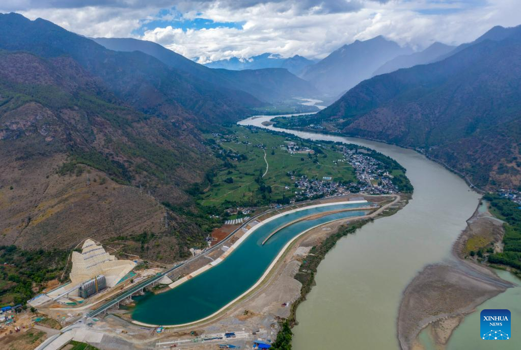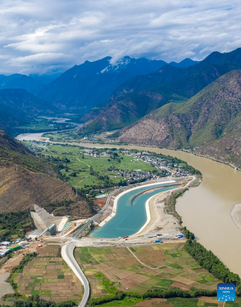 This aerial photo taken on June 20, 2023 shows the construction site of the water sourcing section of the Central Yunnan Water Diversion Project in Shigu Town of Lijiang City, southwest China's Yunnan Province. Shigu Town of Lijiang City is located by a huge bend of the Jinsha River, the upper section of the Yangtze River in southwest China. The footprints of the Red Army are forever engraved in the town's culture and spirits. The Central Yunnan Water Diversion Project, a national key project for water conservancy, is under construction and is expected to benefit more people after completion. Generations of locals have worked hard to plant willows along the river to protect water, soil and the ecological environment. By the river thrives a new Shigu Town. (Xinhua/Chen Xinbo)
