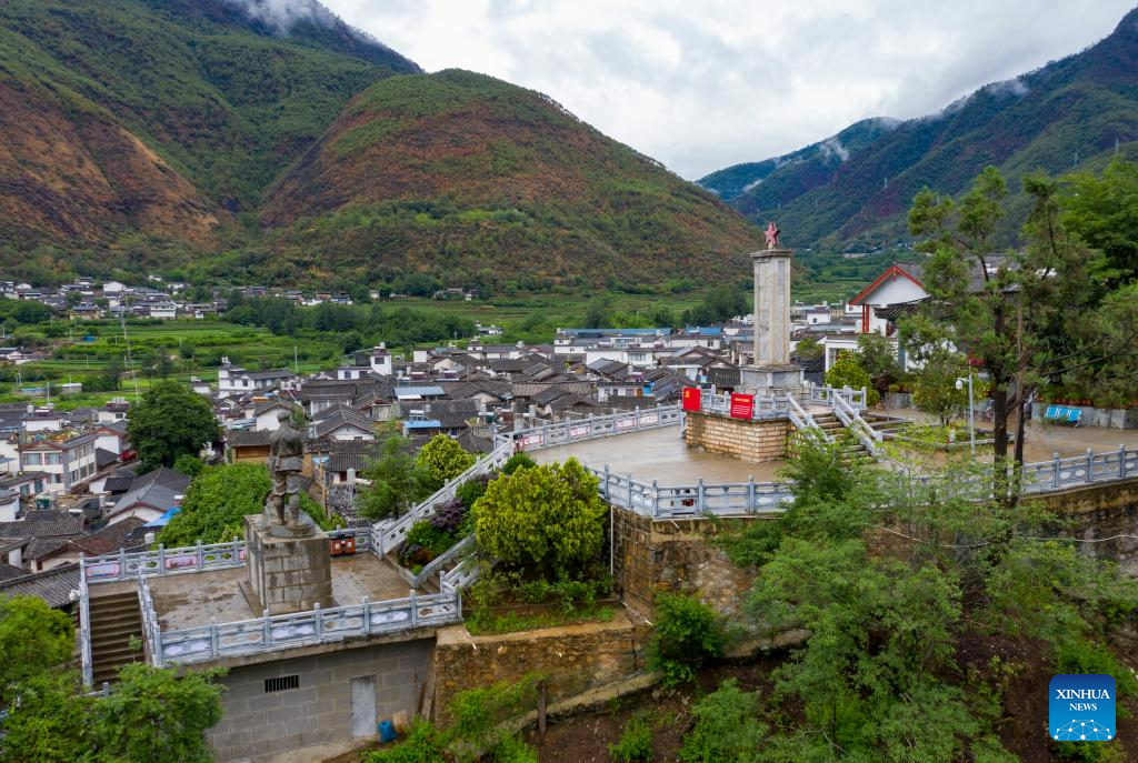 This aerial photo taken on June 13, 2023 shows a view of the Red Army's Long March memorial hall in Shigu Town of Lijiang City, southwest China's Yunnan Province. Shigu Town of Lijiang City is located by a huge bend of the Jinsha River, the upper section of the Yangtze River in southwest China. The footprints of the Red Army are forever engraved in the town's culture and spirits. The Central Yunnan Water Diversion Project, a national key project for water conservancy, is under construction and is expected to benefit more people after completion. Generations of locals have worked hard to plant willows along the river to protect water, soil and the ecological environment. By the river thrives a new Shigu Town. (Xinhua/Chen Xinbo)