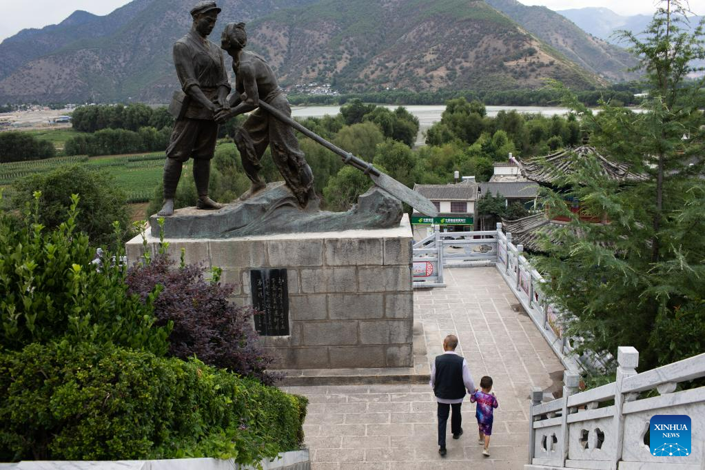 Wang Zirong, a veteran, walks past a statue with his grandson at the Red Army's Long March memorial hall in Shigu Town of Lijiang City, southwest China's Yunnan Province, June 20, 2023. Shigu Town of Lijiang City is located by a huge bend of the Jinsha River, the upper section of the Yangtze River in southwest China. The footprints of the Red Army are forever engraved in the town's culture and spirits. The Central Yunnan Water Diversion Project, a national key project for water conservancy, is under construction and is expected to benefit more people after completion. Generations of locals have worked hard to plant willows along the river to protect water, soil and the ecological environment. By the river thrives a new Shigu Town. (Xinhua/Jin Liwang)