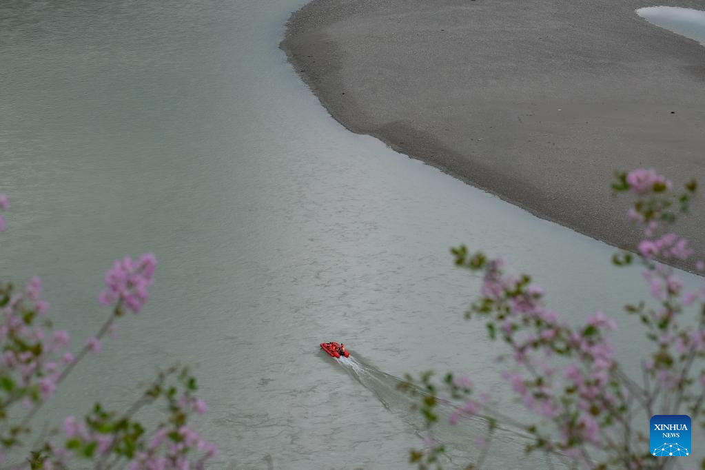 This photo taken on June 20, 2023 shows tourists riding a rubber boat in Shigu Town of Lijiang City, southwest China's Yunnan Province. Shigu Town of Yulong County is located by a huge bend of the Jinsha River, the upper section of the Yangtze River in southwest China. The footprints of the Red Army are forever engraved in the town's culture and spirits. The Central Yunnan Water Diversion Project, a national key project for water conservancy, is under construction and is expected to benefit more people after completion. Generations of locals have worked hard to plant willows along the river to protect water, soil and the ecological environment. By the river thrives a new Shigu Town. (Xinhua/Zhang Cheng)
