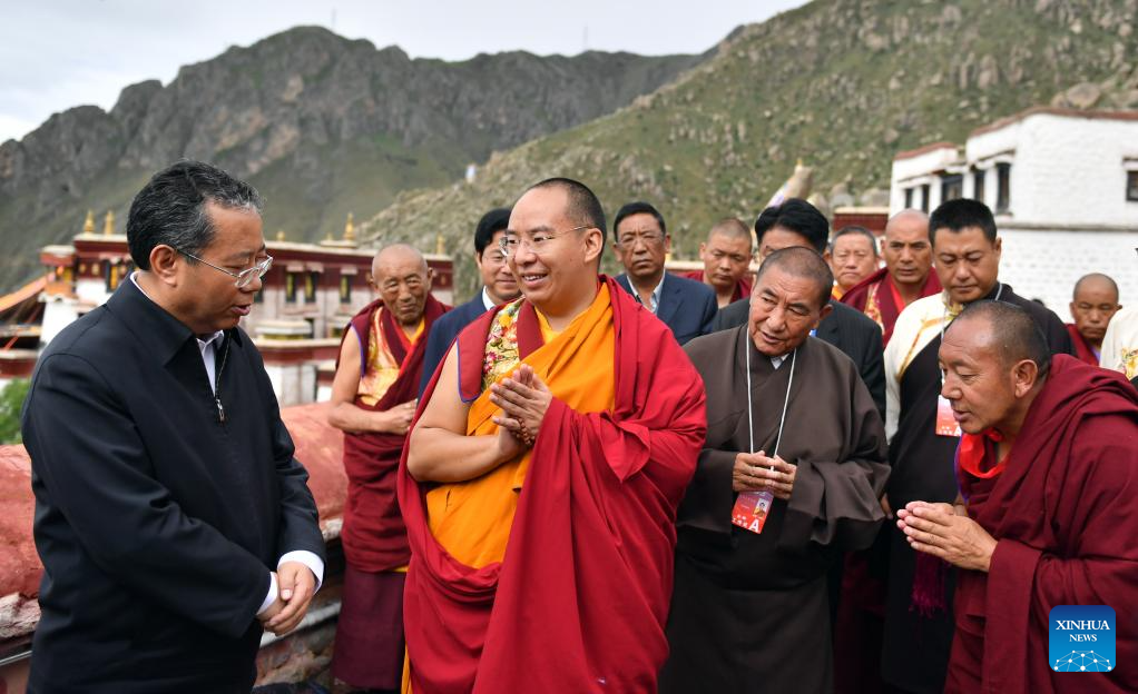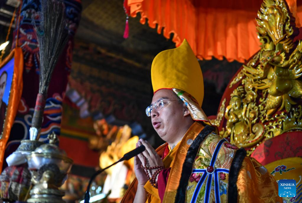 Panchen Erdeni Chos-kyi rGyal-po attends religious activities at the Drepung Monastery in Lhasa, capital city of southwest China's Tibet Autonomous Region, July 5, 2023. (Photo by Chogo/Xinhua)