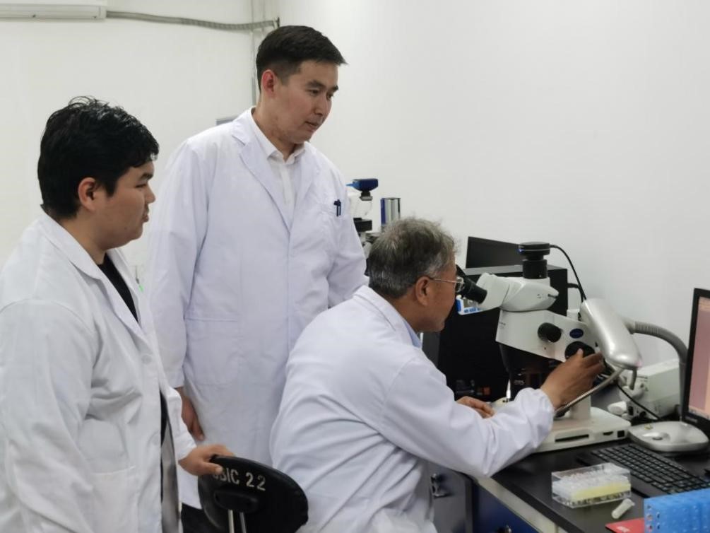 Kazakh student Marat Muratkhan (middle) does experiments in a laboratory. (Photo from nkb.com.cn)