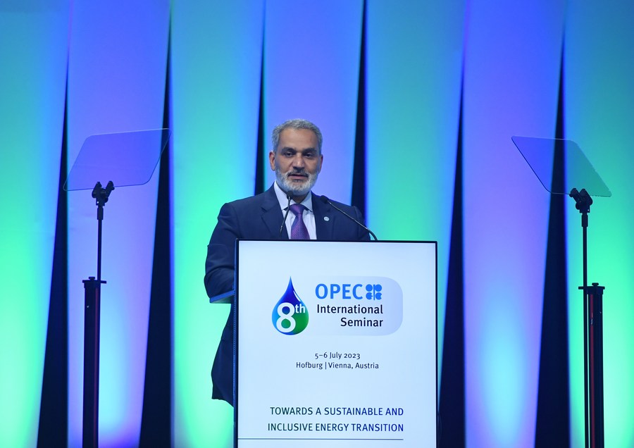 OPEC Secretary General Haitham Al Ghais delivers a speech during the 8th OPEC International Seminar in Vienna, Austria, July 5, 2023. (Xinhua/He Canling)
