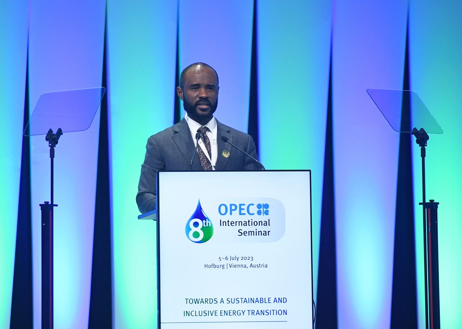 Antonio Oburu Ondo, president of the OPEC Conference in 2023 and Equatorial Guinea's minister of mines and hydrocarbons, delivers a speech during the 8th OPEC International Seminar in Vienna, Austria, July 5, 2023. (Xinhua/He Canling)