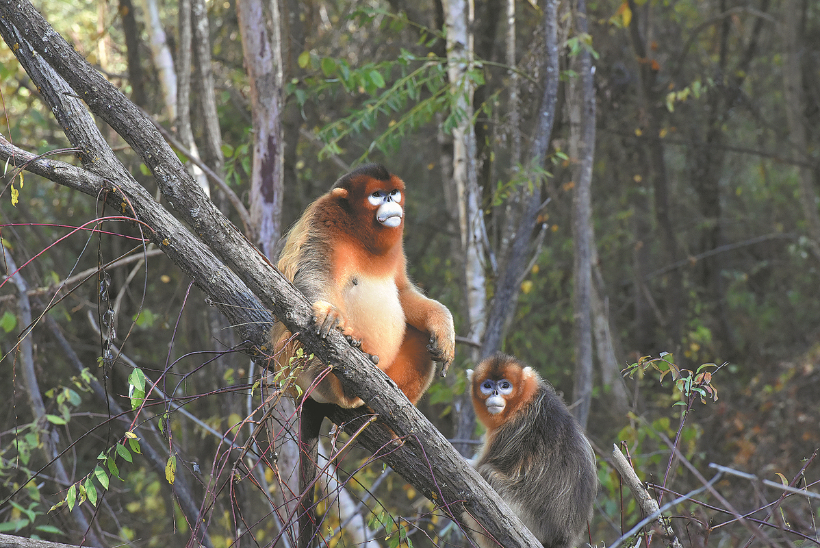 Two golden snub-nosed monkeys sit on a tree in Jiuzhaigou. TANG YULIN/FOR CHINA DAILY