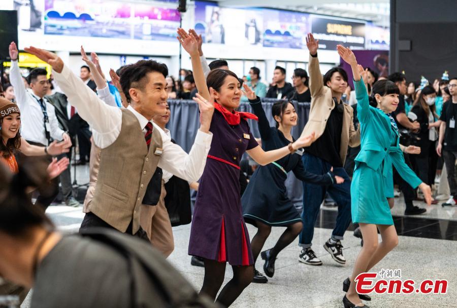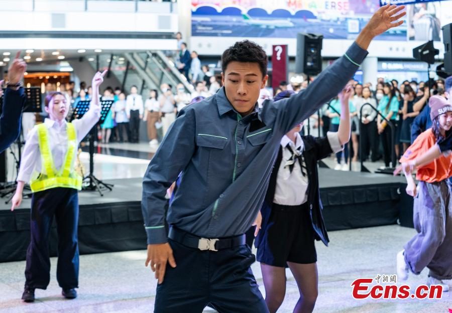 Artists and airport staff perform a flash mob dance to celebrate the 25th anniversary of the Hong Kong International Airport (HKIA) in the Hong Kong Special Administrative Region, July 6, 2023. (Photo: China News Service/Hou Yu)