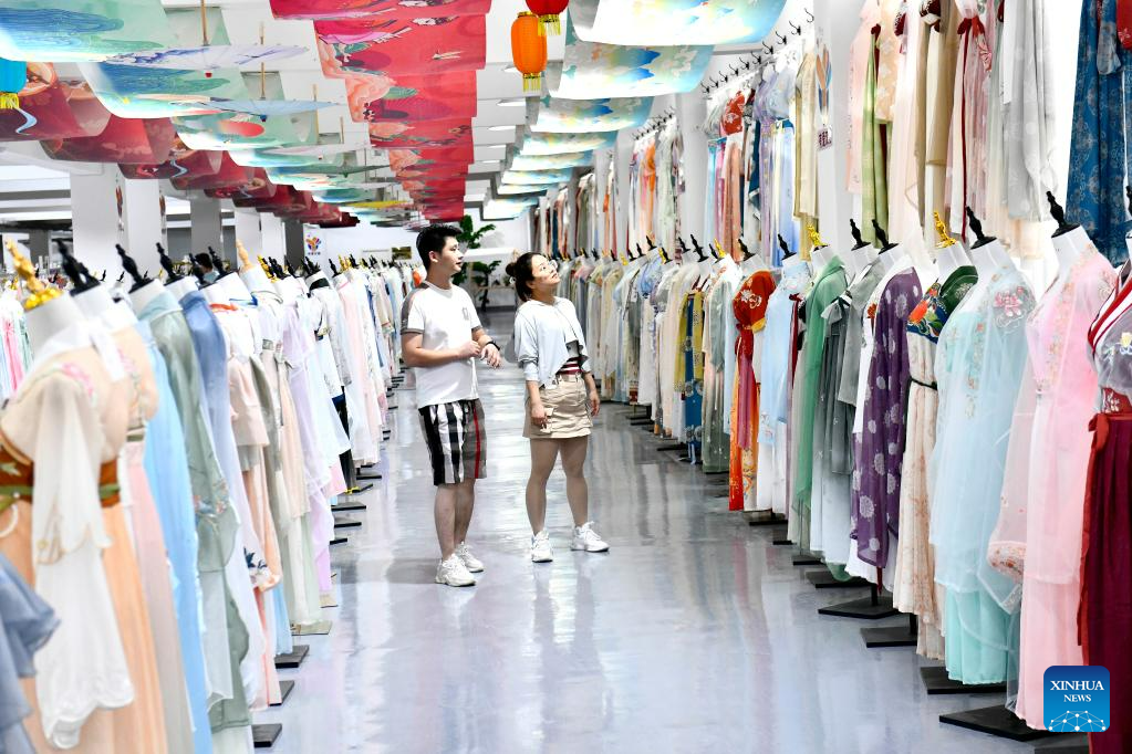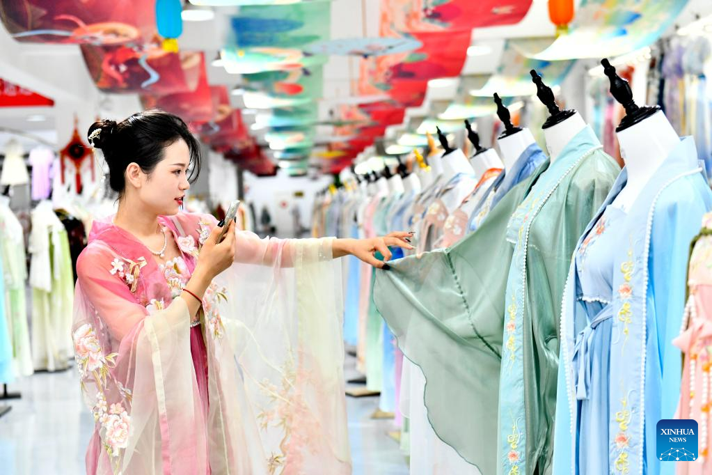 Customers select traditional Chinese Hanfu clothing at a Hanfu base in Caoxian County, east China's Shandong Province, July 6, 2023. Caoxian County has developed a complete Hanfu industrial chain in recent years. At present, there are more than 2,100 Hanfu-related enterprises in the county. The sales of Hanfu in Caoxian reached nearly 4 billion yuan (about 552 million U.S. dollars) in the first half of this year. (Xinhua/Guo Xulei)