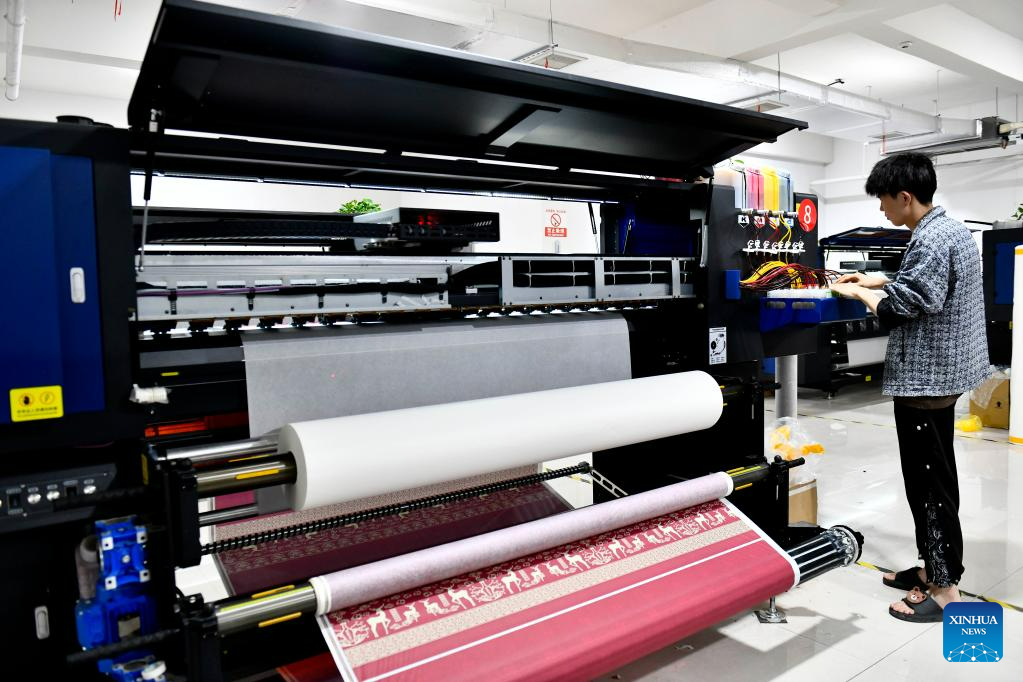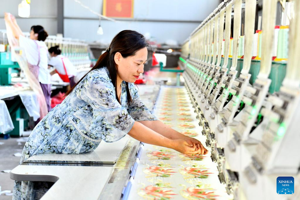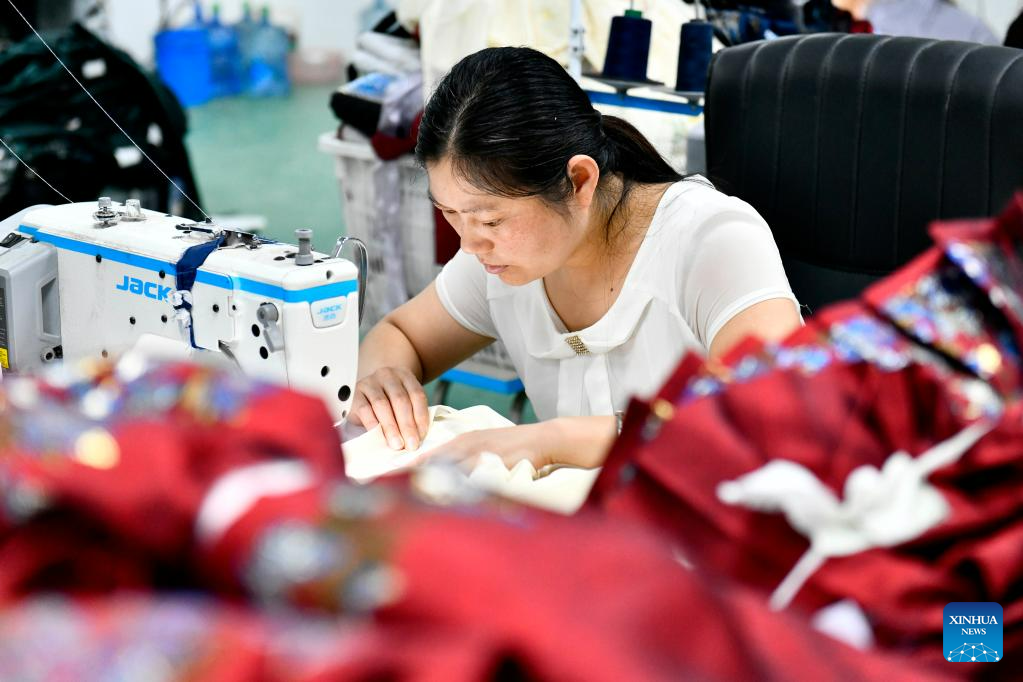 A staff member works at a Hanfu-related factory in Caoxian, east China's Shandong Province, July 6, 2023. Caoxian County has developed a complete Hanfu industrial chain in recent years. At present, there are more than 2,100 Hanfu-related enterprises in the county. The sales of Hanfu in Caoxian reached nearly 4 billion yuan (about 552 million U.S. dollars) in the first half of this year. (Xinhua/Guo Xulei)