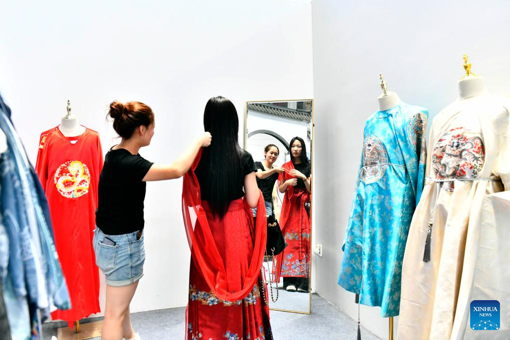 A customer tries on traditional Chinese Hanfu clothing at a company in Caoxian County, east China's Shandong Province, July 6, 2023. Caoxian County has developed a complete Hanfu industrial chain in recent years. At present, there are more than 2,100 Hanfu-related enterprises in the county. The sales of Hanfu in Caoxian reached nearly 4 billion yuan (about 552 million U.S. dollars) in the first half of this year. (Xinhua/Guo Xulei)